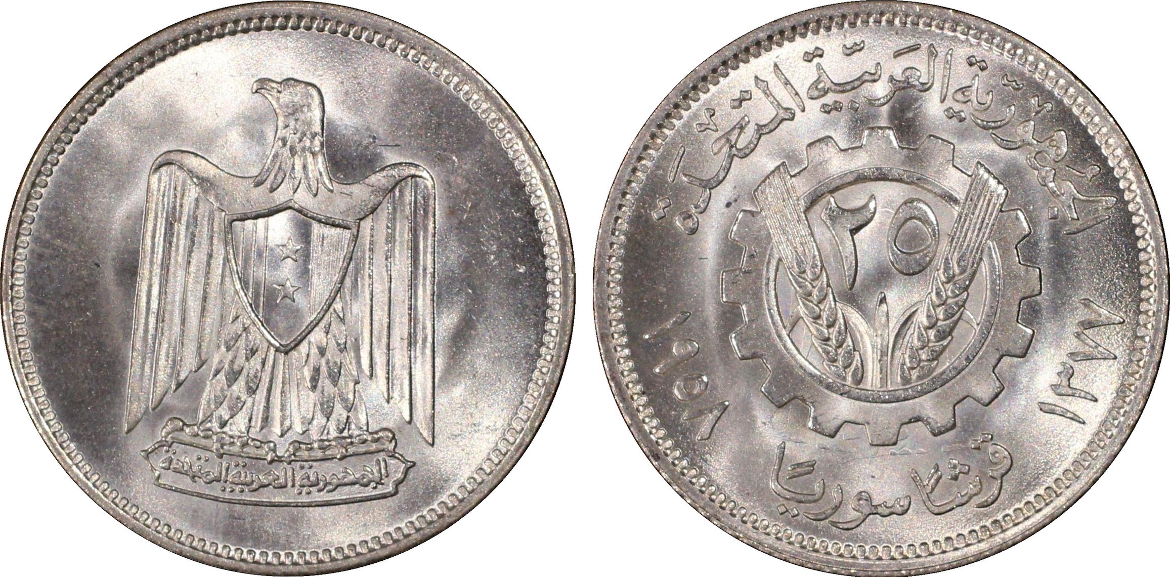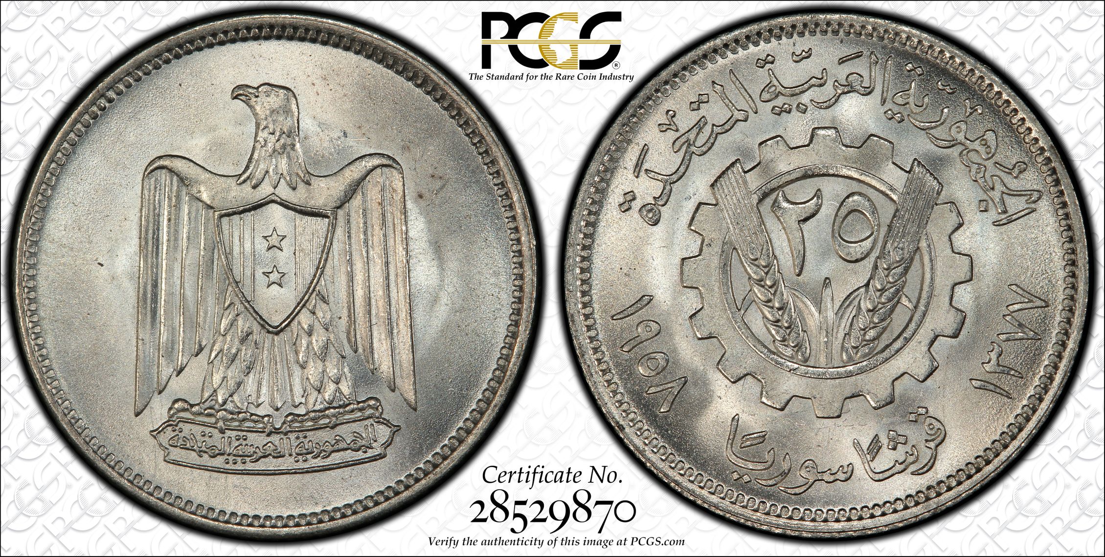此证书是目前出现在 Brandywine Set Registry库存和的一个set或多个set,其中包括 Brandywine Syria UAR Complete Circulation Strikes Set (1958 - 1960)