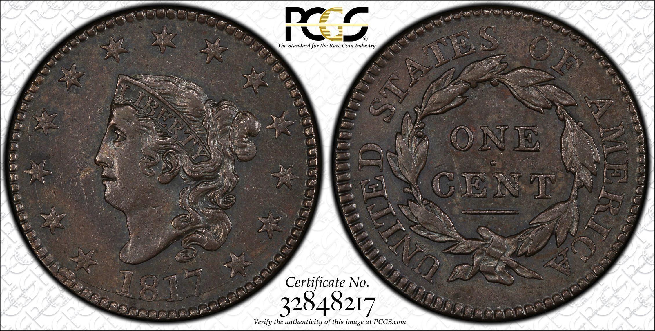 此证书是目前出现在 DLH Set Registry库存和的一个set或多个set,其中包括 D. L. Hansen Newcomb Die. Large Cents. (1816-1839)