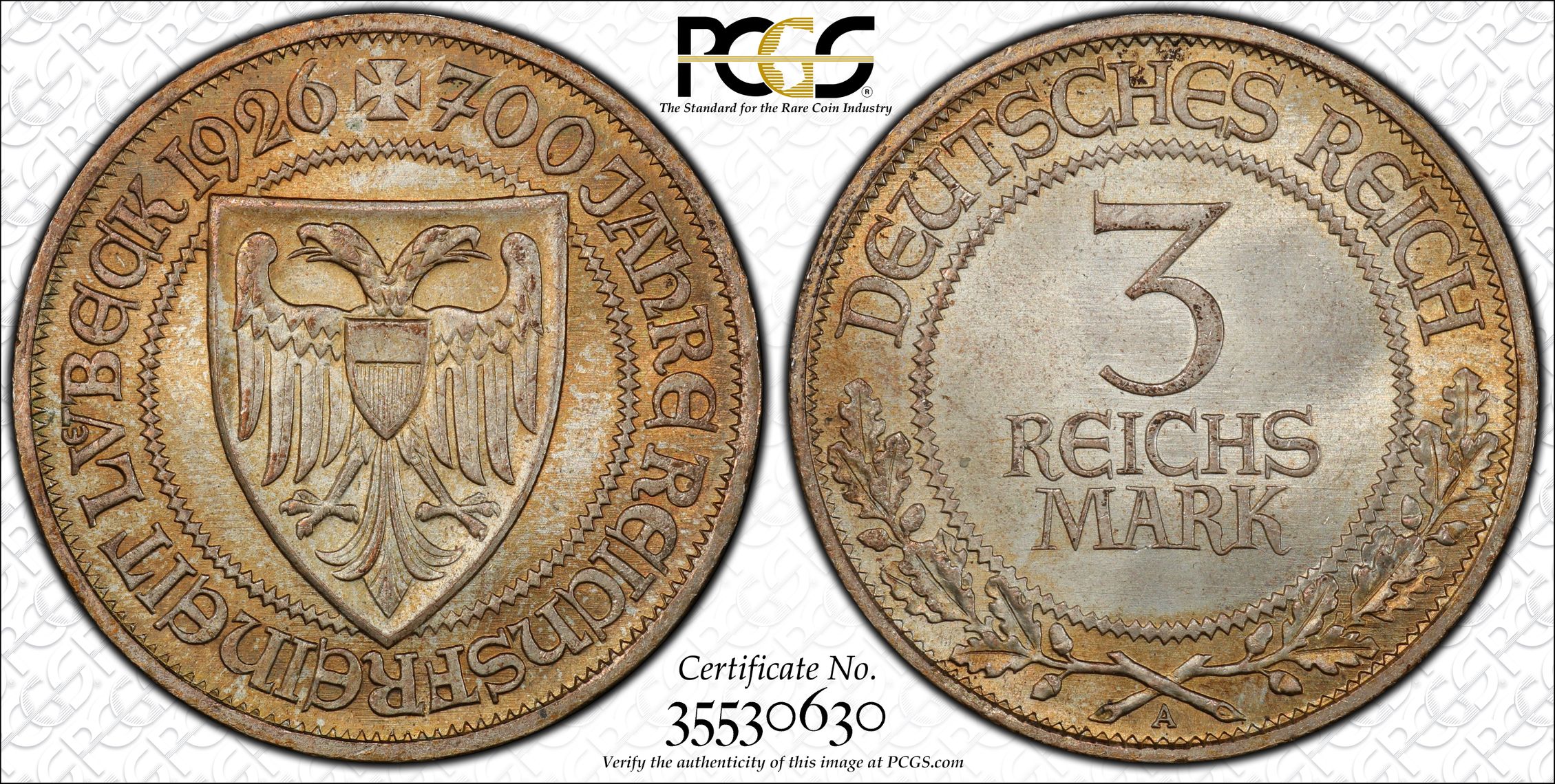 PCGS 钱币信息 | 认证编号 #35530630 - 1926-A Germany, Weimar Rep. 3 Mk