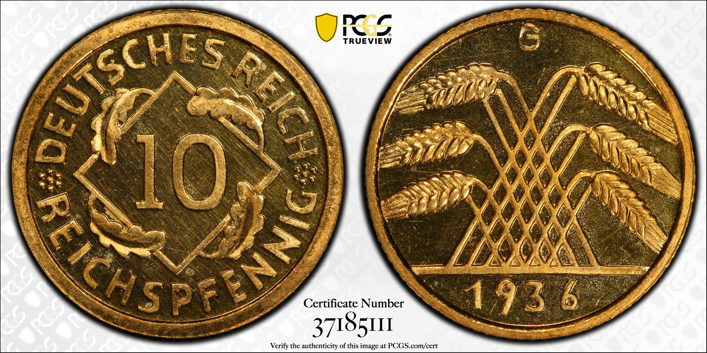 PCGS 钱币信息 | 认证编号 #37185111 - 1936-G Germany, Weimar Rep. 10 Rcpfg