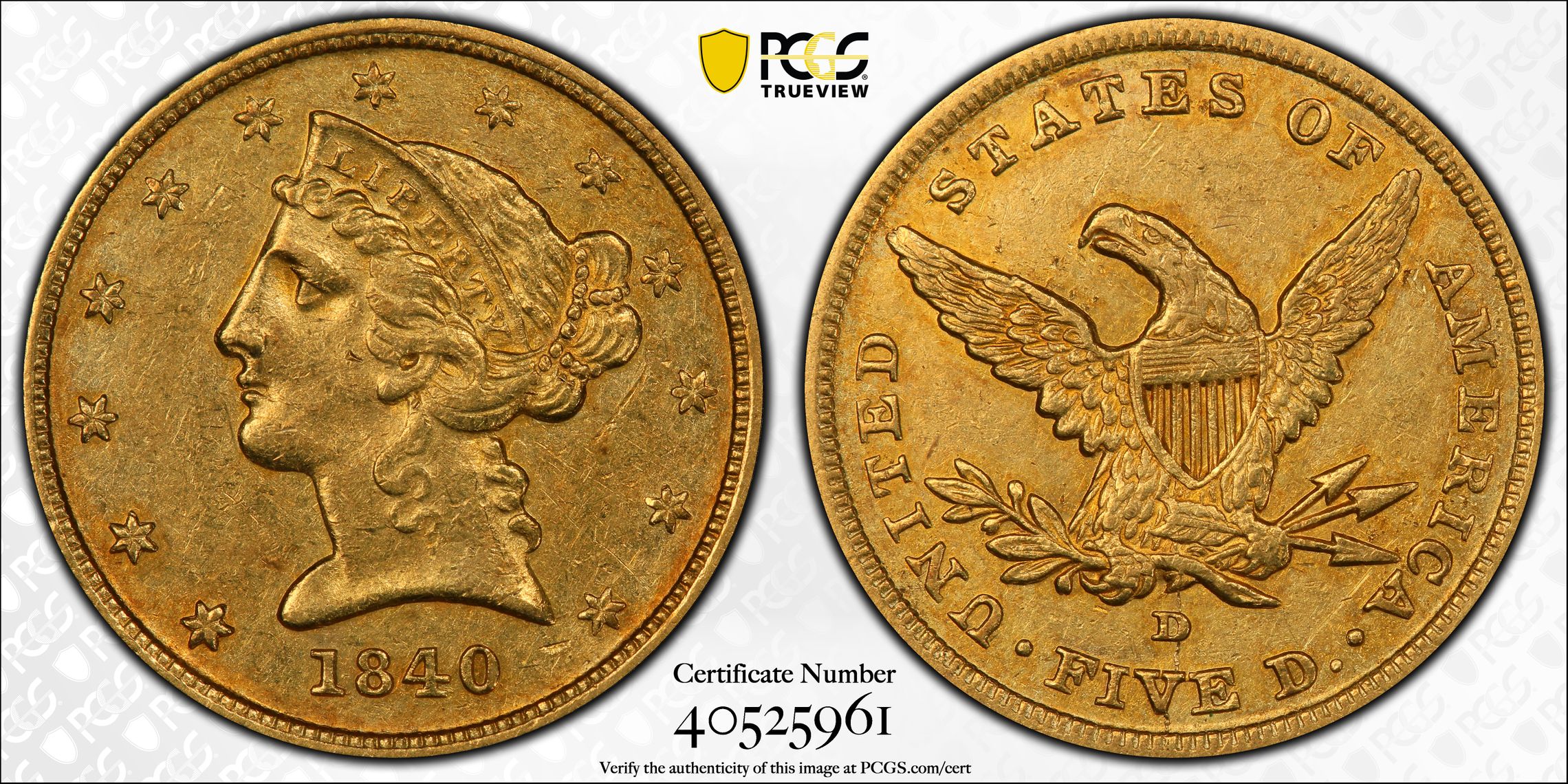 此证书是目前出现在 DLH Set Registry库存和的一个set或多个set,其中包括 D. L. Hansen $5 Gold Complete (1795-1929)