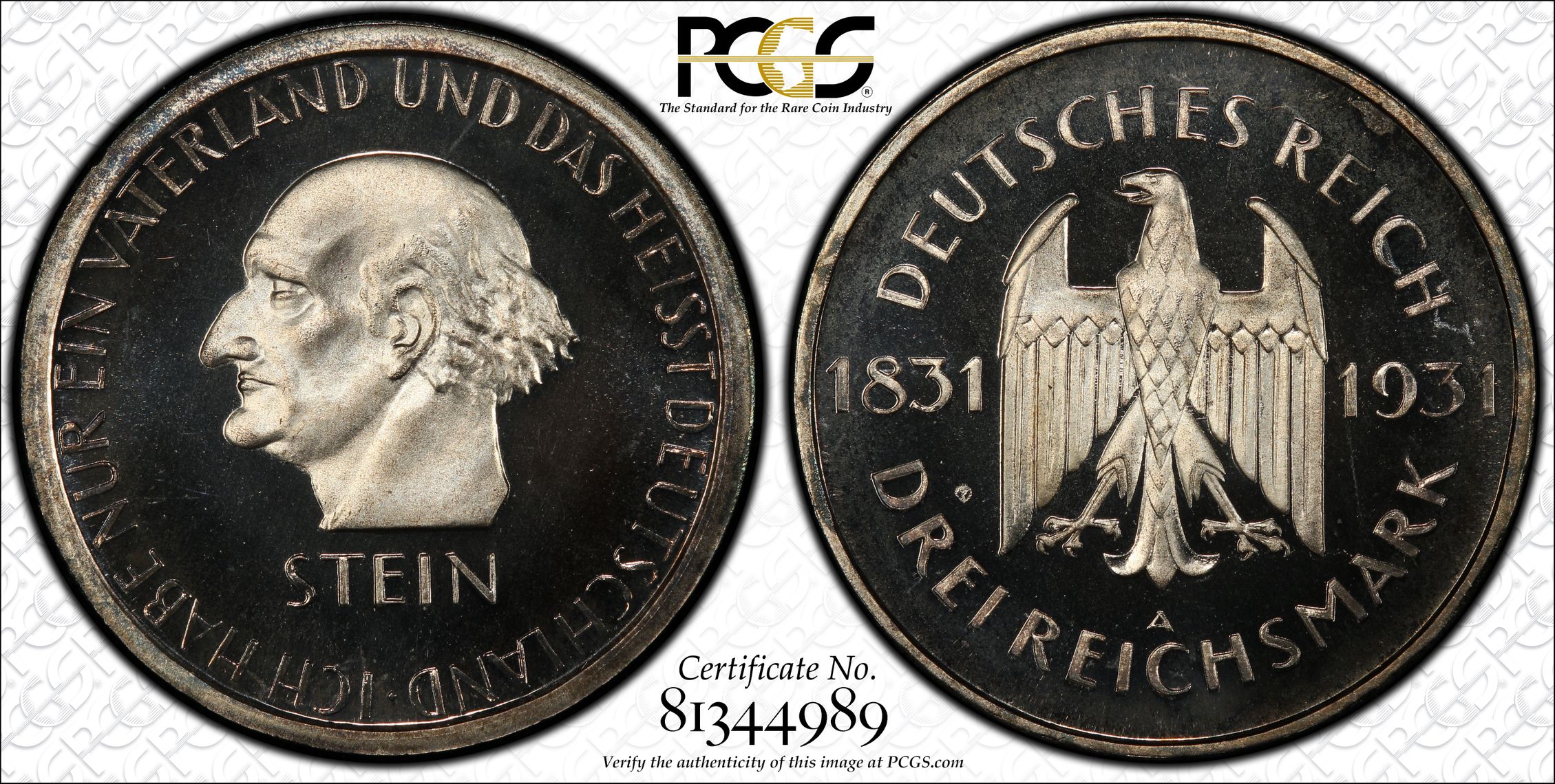 PCGS 钱币信息 | 认证编号 #81344989 - 1931-A Germany, Weimar Rep. 3 Mk