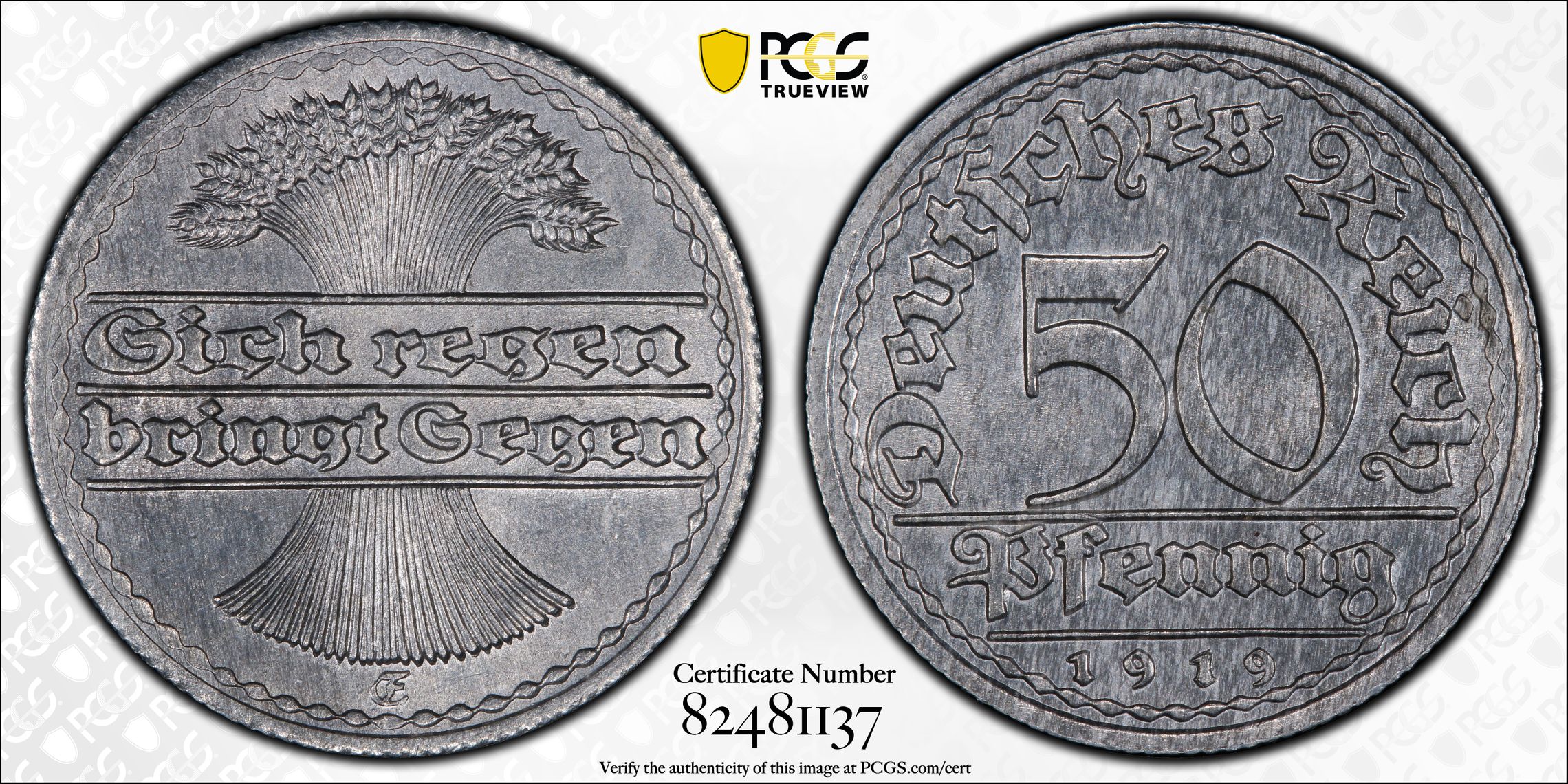 PCGS 钱币信息 | 认证编号 #82481137 - 1919-E Germany, Weimar Rep. 50 Pfg