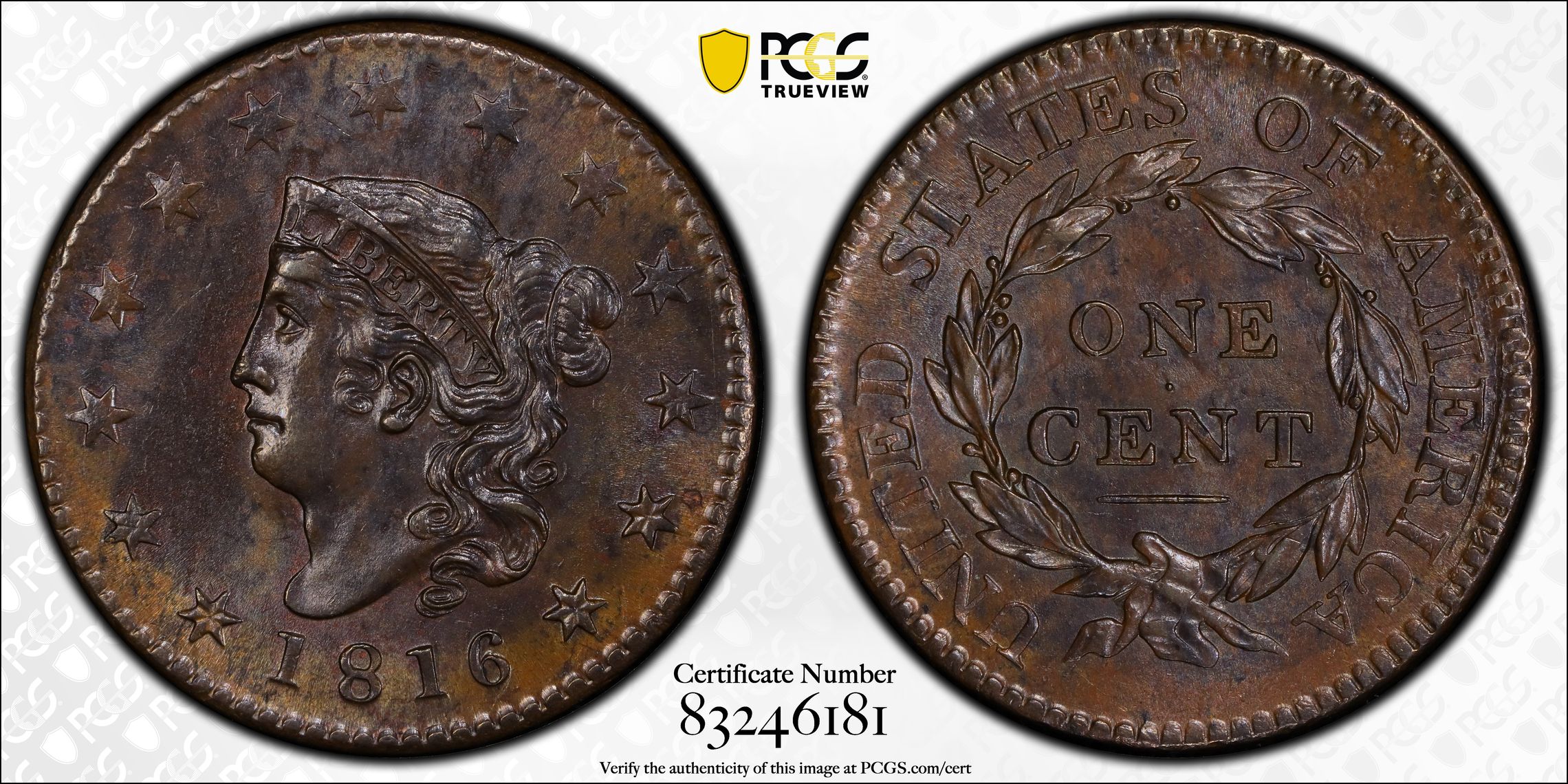 此证书是目前出现在 DLH Set Registry库存和的一个set或多个set,其中包括 D. L. Hansen Newcomb Die. Large Cents. (1816-1839)
