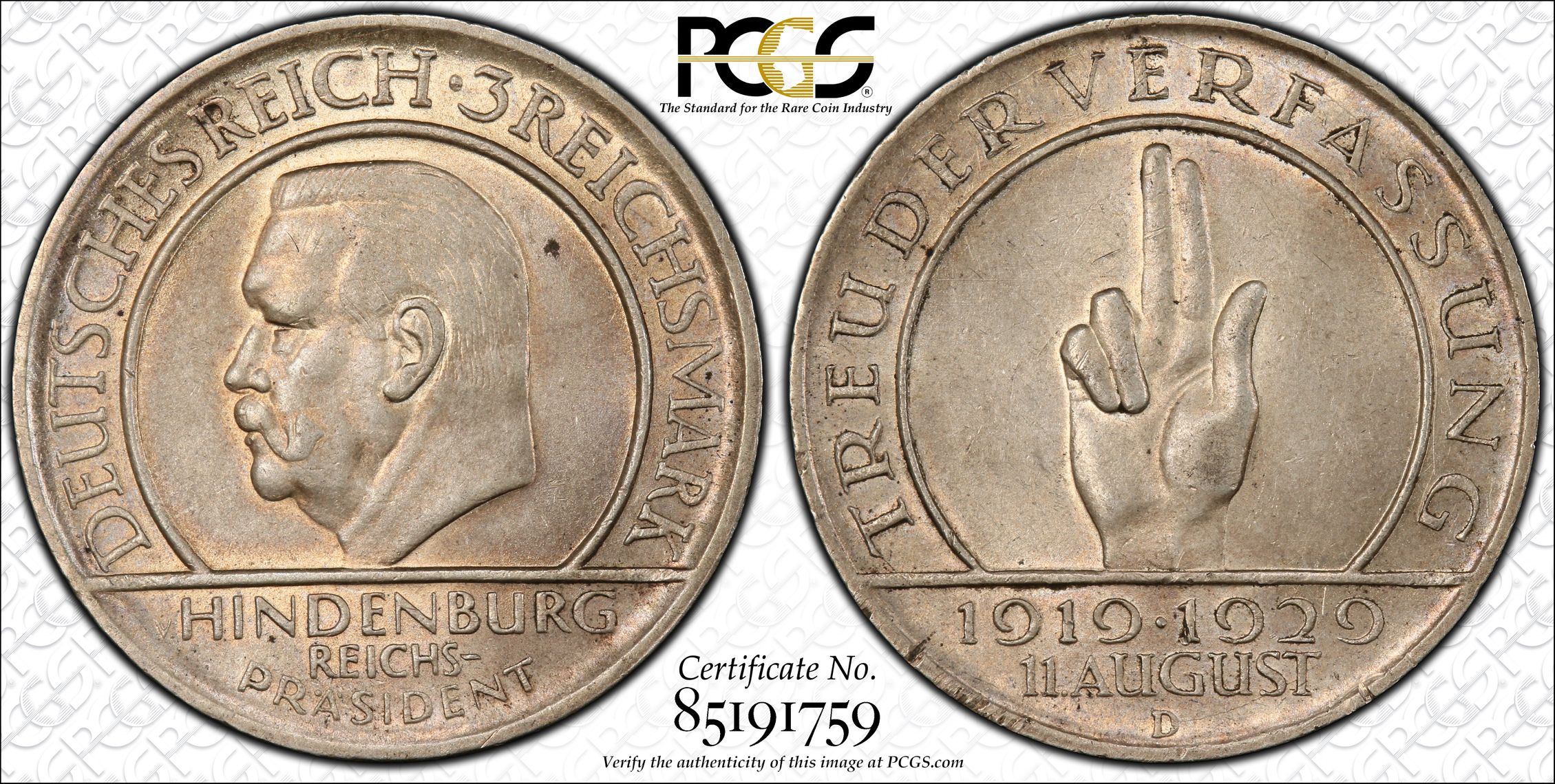 PCGS 钱币信息 | 认证编号 #85191759 - 1929-D Germany, Weimar Rep. 3 Mk
