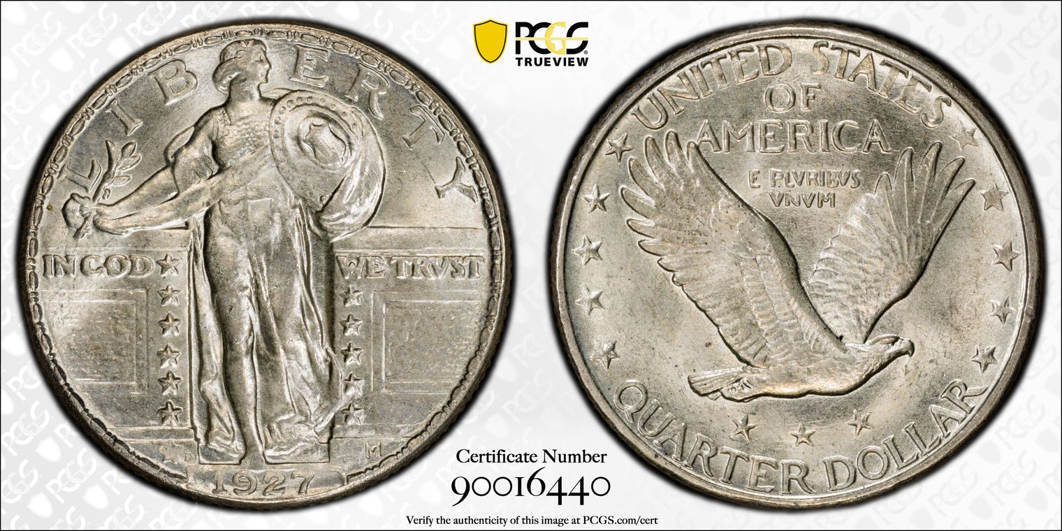 Ex Richmond Collection (NGC Cert# 1716019-043), Ex Pelican Bay Collection (NGC Cert# 1716019-043). Coin was graded MS65 at NGC at time of purchase and was down graded to MS64 when sent to PCGS. This example became the 5th graded MS64 at PCGS. Briggs 1-A, Flynn-RPD-001. The 1865-S is a well-known condition rarity in Gem Mint State or finer grades. The mintage was small -- only 41,000 pieces were struck. Virtually all of the mintage circulated in West Coast commerce at a time when silver coins were in extremely short supply. Consequently, even circulated examples are rare in all grades today. The typical surviving 1865-S quarter is well worn, with an average certified grade of just 40.1. This MS65 example is the former Richmond Collection coin and currently serves as NGC Coin Explorer's plate coin. Frosted Gem surfaces display an attractive pearlescent sheen from light-gold toning supported by strong silver luster throughout both sides. The smooth surfaces show only a few faint grazes and no individual marks of note. The 1 in the date is repunched at its base and the strike weakens slightly at 8 and 6, as well as at a few star centers. The surface quality and eye appeal are exceptional. NGC Census: 1 in 65, 1 finer.