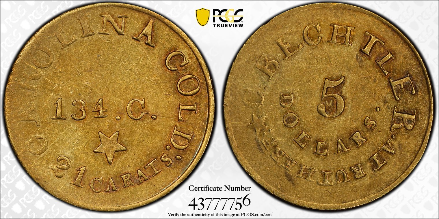 (1834-37) $5 "C:"Bechtler, Carolina Gold Reeded Edge XF45
