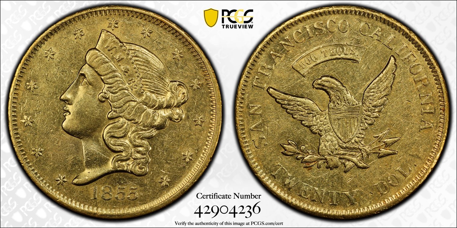 1855 $20 Wass, Molitor & Co. Large Head AU53