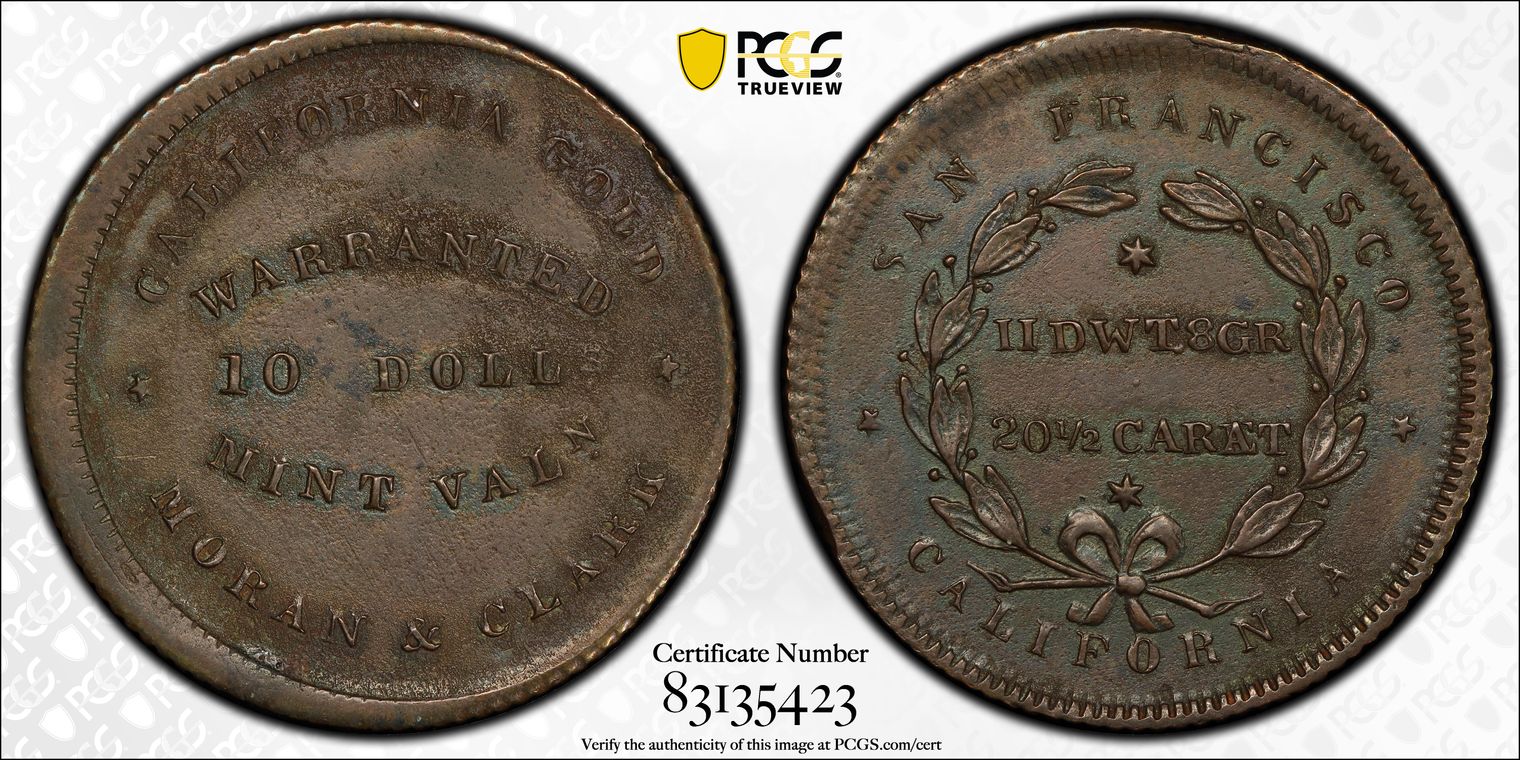 (1849) DT$10 Moran & Clark Copper Die Trial AU53BN