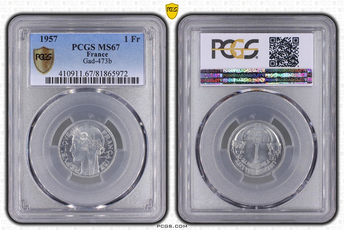 Flan de 1 franc Semeuse, nickel Qualité SUP+ mais PCGS ne grade pas les flans vierges. Ces pièces rentrent dans la catégorie générique #11111 affectée par défaut aux États-Unis... Nom de l'atelier/ville : Paris Diamètre : 23,50 mm Poids : 6,01 g.