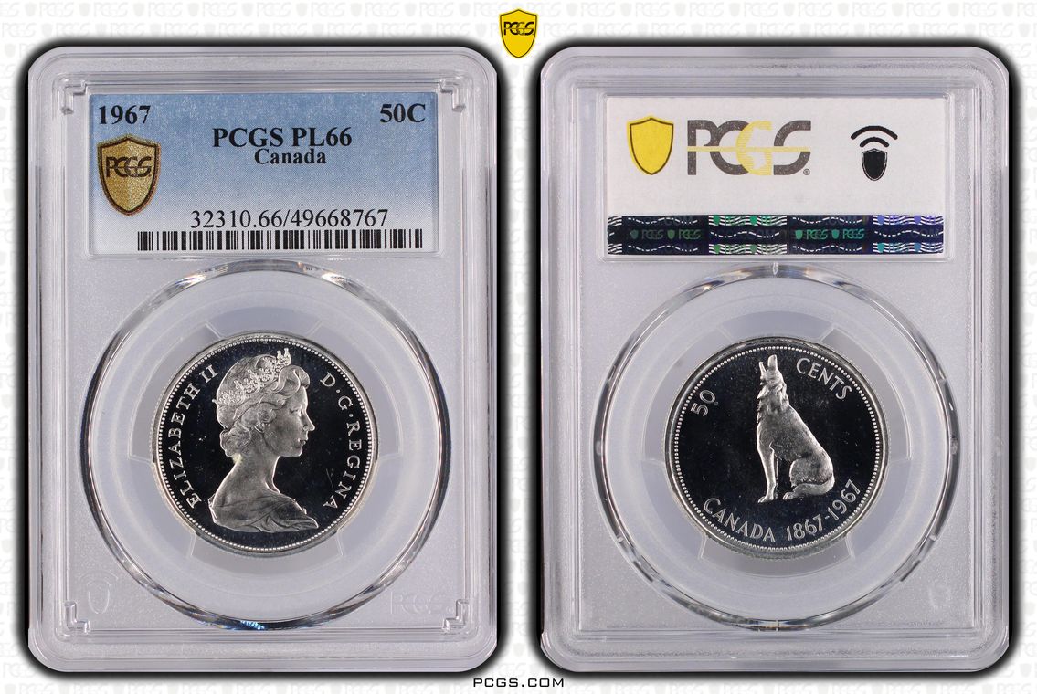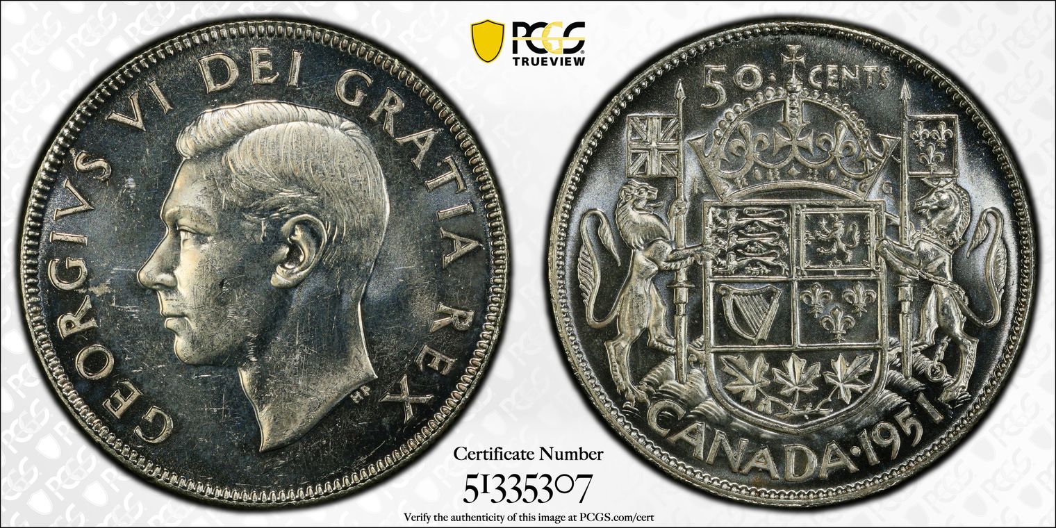 Canada 50 Cents Silver (.800 silver .200 copper), 29.72mm / 11.64 g. Canada reduced the size to 27.13mm in 1968, switched to 99.9% nickel, and fully stopped minting 50 cent circulation strike coins in 2003. In 1965, 12,629,974 coins were minted (the highest mintage of the country's 50 cent coin) at the Royal Canadian Mint of Ottawa, Canada. The obverse features a bust of Queen Elizabeth II, at 37 years of age (2nd portrait version), wearing a tiara and facing right within the legend, "ELIZABETH II DEI GRATIA REGINA." Canada began circulating coins featuring King Charles III in early December 2023. The reverse depicts the Royal Coat of Arms of Canada surrounded with the face value and the country name.