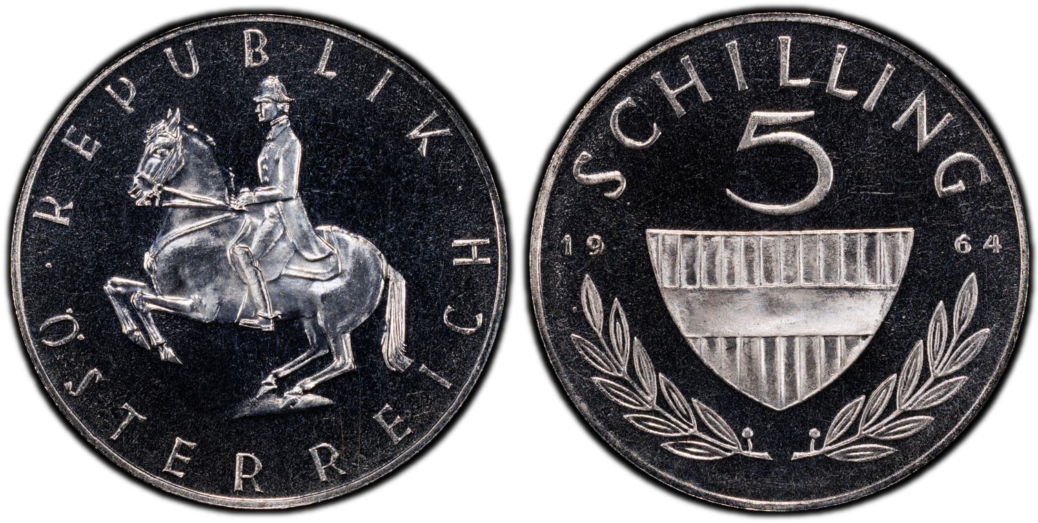 Austria 25 Schilling - Silver (.800), Copper (.200), 30mm / 13 g. The mint at Vienna struck 1,563,000 business strikes and 37,000 proofs of this coin design in 1965. This was a non circulating commemorative coin. The obverse features the denomination centered and surrounded by the nine heraldic shields of the Austrian provinces and the Austrian coat of arms. This coin is typically presented in a holder with the reverse on the front. The reverse commemorates the 150th Anniversary of the Vienna Polytechnic Institute with a bust of Johann Joseph Ritter von Prechtl, who founded the Institute in 1815 and was its first director. The coin also features incuse edge lettering "FUENFUNDZWANZIG SCHILLING."