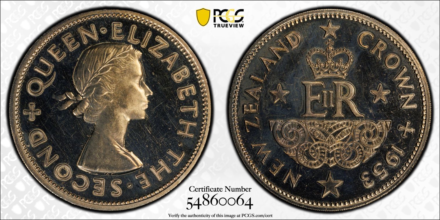 New Zealand Shilling Copper-Nickel, 23.62mm / 5.64 g. New Zealand introduced the Shilling in 1932 in silver and after a switch to copper nickel in 1947, it continued to be minted until 1965, after which the country replaced the Shilling with the Dollar. In 1965 the Royal Mint, UK struck 3.5 million business strike coins (plus an additional 275,000 business strikes included in mint sets) and 25,000 proof strikes. This is a representee example of the proof issue. The obverse of the Shilling design features the current British monarch as do all other British territory coins, which was Queen Elizabeth II in 1965. The reverse designs result from a collaboration between the Royal Mint and the territory government. The Royal Mint initially proposed a Kiwi (a rare pattern of the kiwi design exists) which was rejected by the local government. Despite the Royal Mint suggesting the coin was too small to depict a full figure, the final design featured a crouched Māori warrior holding a taiaha (traditional Māori staff weapon), with lettering "NEW ZEALAN" and "ONE SHILLING" and the date below.