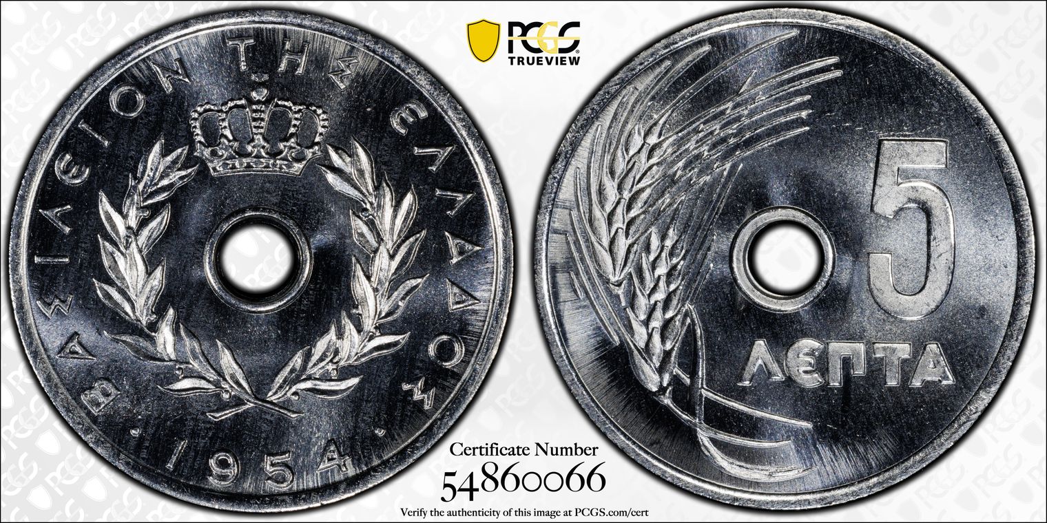 Greece 10 Lepta (95% Aluminum, 5% Magnesium), 22mm. The 3rd modern drachma version of the Greece 10 Lepta was a holed aluminum coin minted from 1954 to 1971 as a standard circulation strike. However, in 1965 Greece only minted and issued the 10 Lepta either within a 7 piece Lepta/Drachma set in a plastic envelope (20,000) or individual proof coins (4,978). All of the 1965 Lepta and Dracham coins were minted in Vienna, Austria. The obverse features a wreath of 2 branches with (2x15) 30 leaves, crown at the top, date at bottom, and a legend reading Kingdom of Greece in Greek script. The reverse features Grapes above center hole, double denomination below.