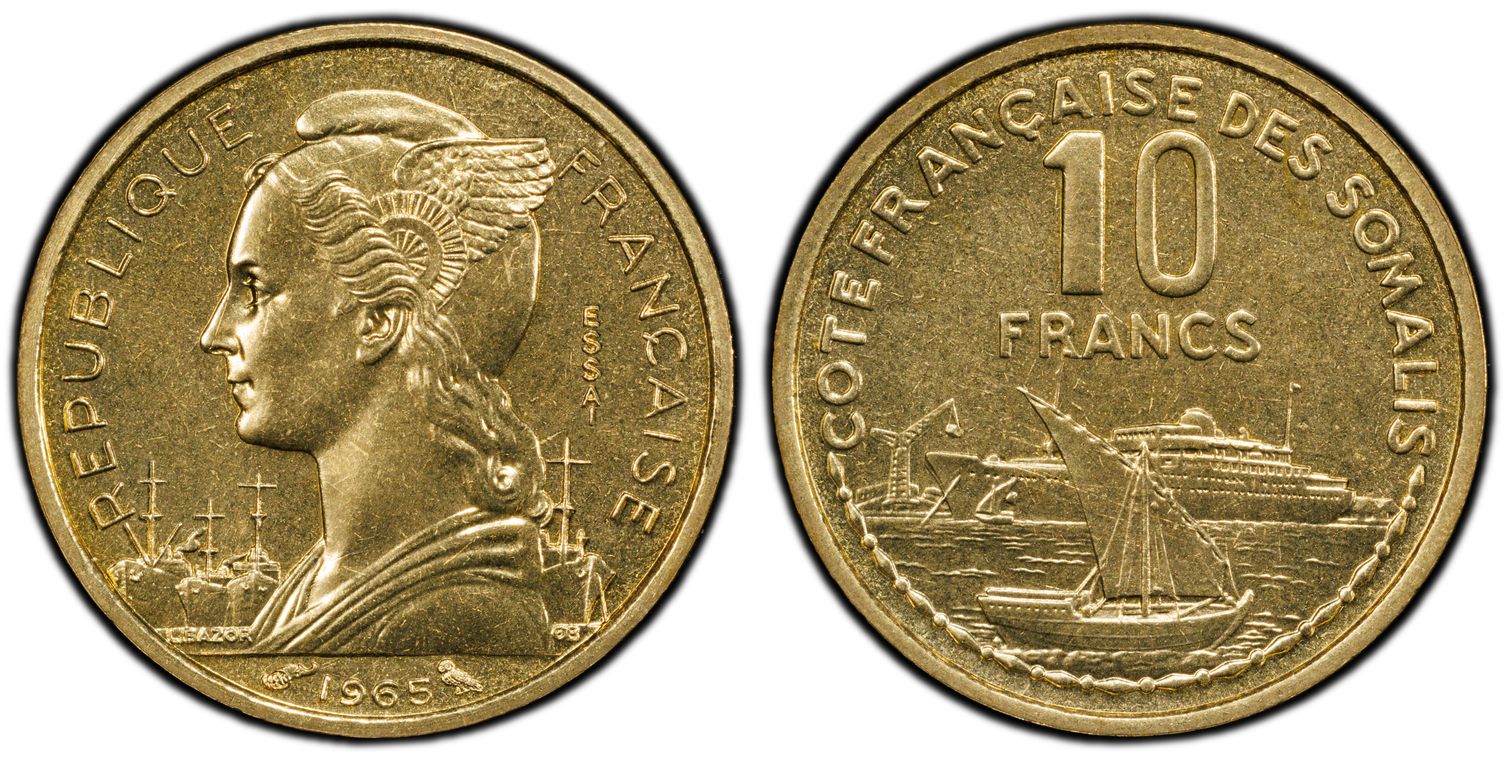 French Polynesia 2 Francs (95% Aluminum, 5% Magnesium), 23mm / 2.2 g. 4.3 million of these standard business strikes were minted at the Paris mint in 1965. The obverse (identical to New Caledonian coins) features Minerva (goddess of wisdom) sitting on a throne, facing left, holding a lit torch in her left hand, with a cornucopia of fruit in a bend of the right arm. Additionally, all coins were reissued in 1965 with the former colonial name "Établissements français de l'Océanie" now replaced with "Polynésie Française." The "owl" signature of the Paris mint's chief engraver, Raymond Joly is present to the right of the date. The reverse depicts palm trees on the left, the sea with a sailboat in the middle, and mountains in the distance. In the foreground is a boat with outrigger plus assorted fruit in a container.