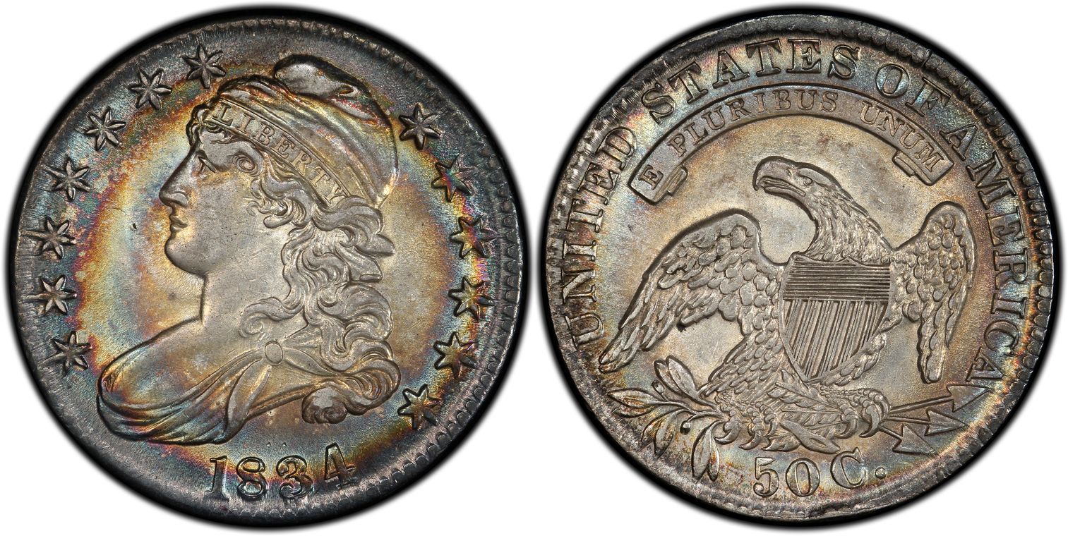 CAC o.102 This coin, and the next lot are two highlights of the present auction. While “only” AU55, these are two of the most stunning bust halves colorwise we have had the honor of offering. Brilliant, frosty silver centers yield to rich, concentric rings of rainbow color, evidence of decades of storage in a Wayte Raymond or other old cardboard album. It is clear that these two lots were a part of the same old time collection. PCGS 144, NGC 32, CAC 21. Throw away the price guides and don’t bother looking at the APRs. This coin is so wonderfully toned that if it was a Morgan dollar, it would garner a 9+ on our 10-point color scale. If the Northern Lights Collector was putting together an AU set of Bust halves, this would be his 1834! How many old time colored halves like this still exist? Good luck finding another! We expect to see world record bids when this one closes.