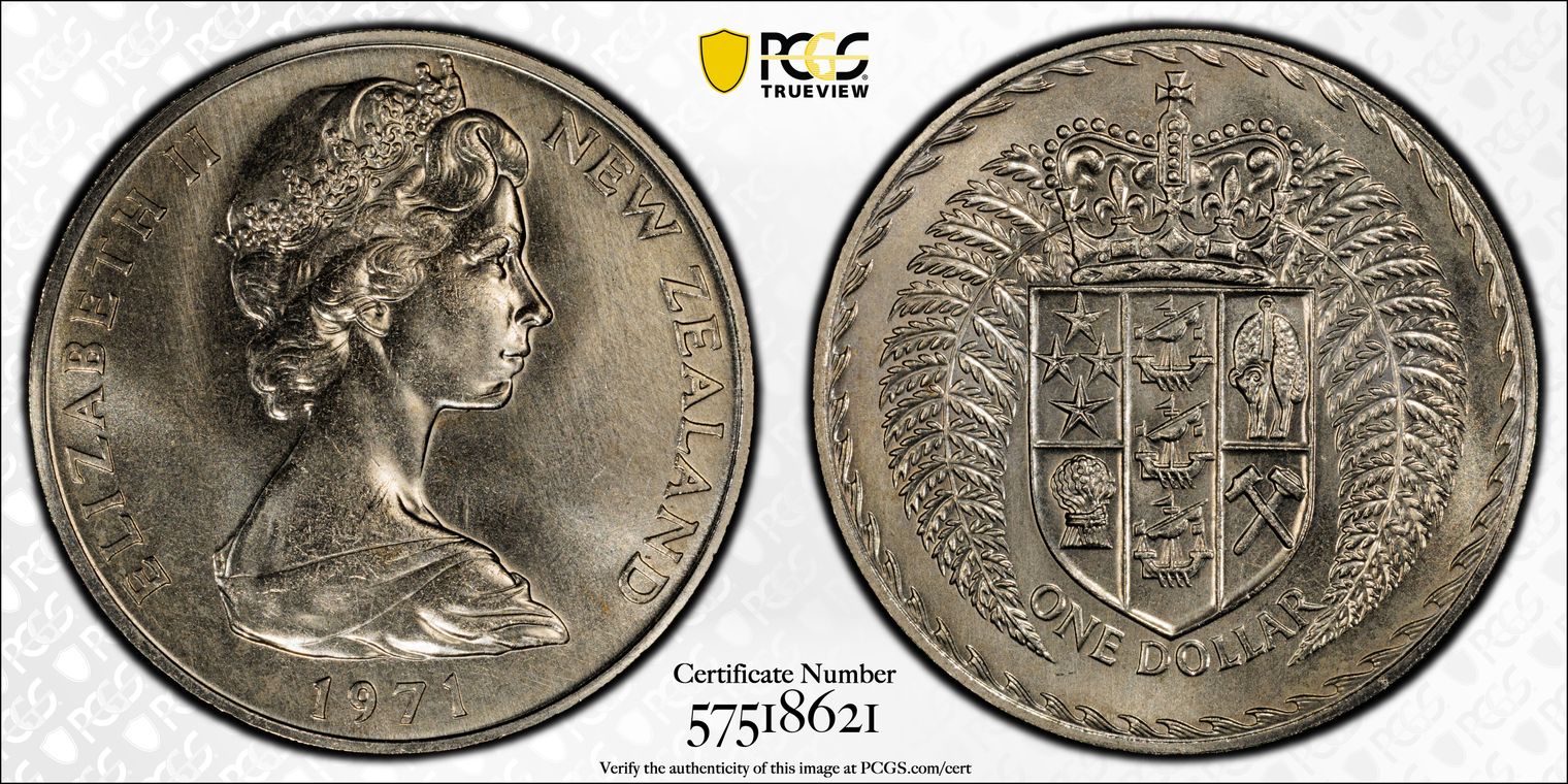 The 1971 $1 NZ Coat of Arms coin is a commemorative coin from New Zealand's "Shield of Arms" series, featuring the Queen's profile on one side and the Coat of Arms on the other. This coin is often sought by collectors, particularly the uncirculated, reeded-edge variety which had a limited mintage of 30,000 and was individually issued.