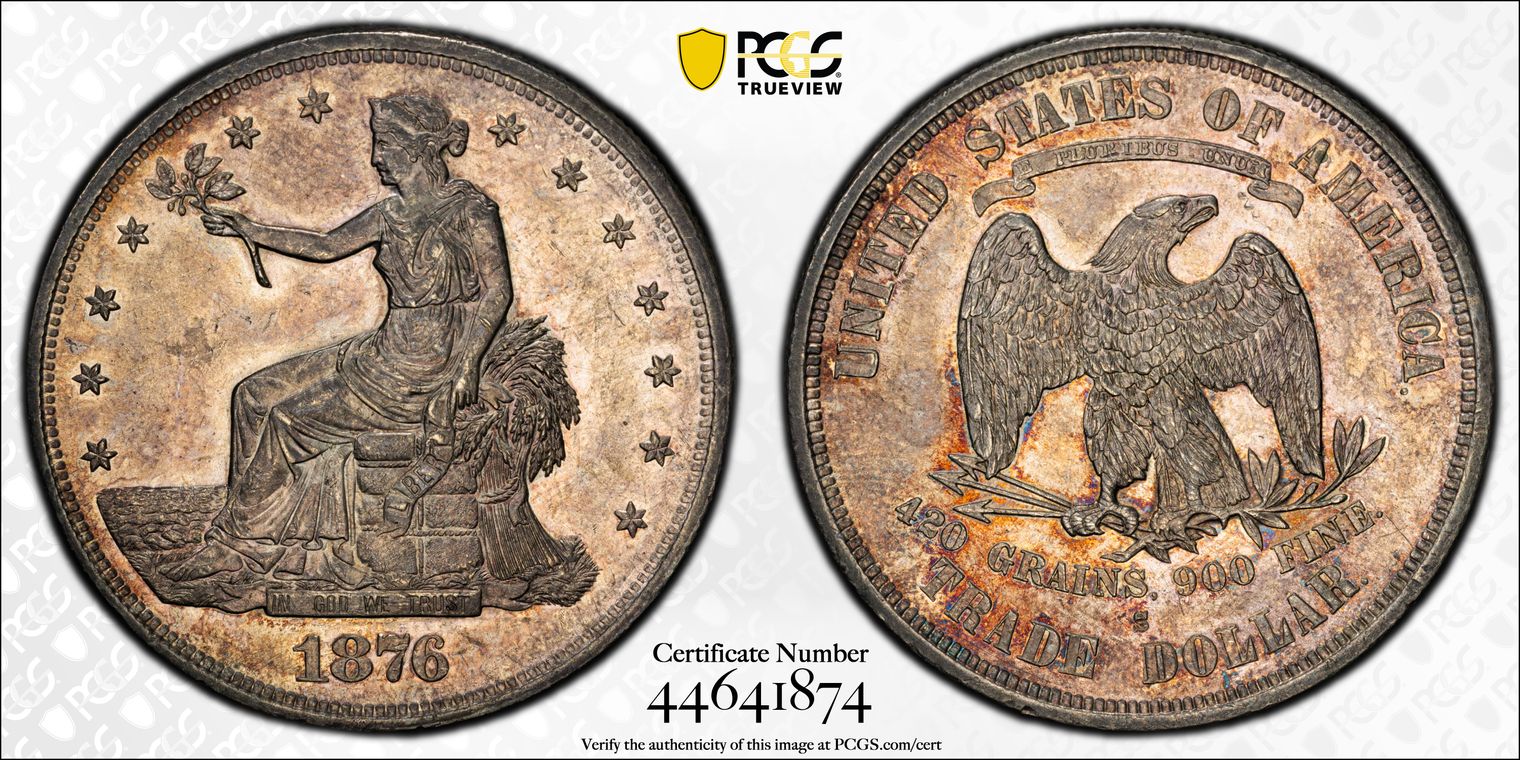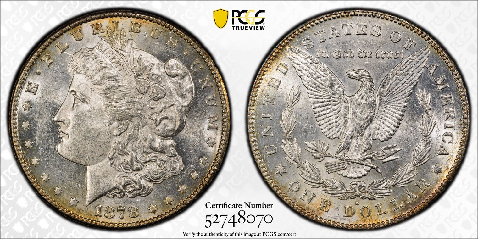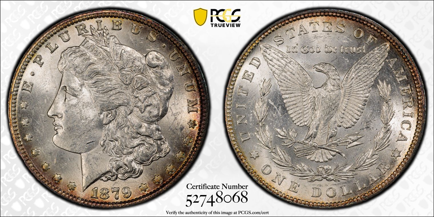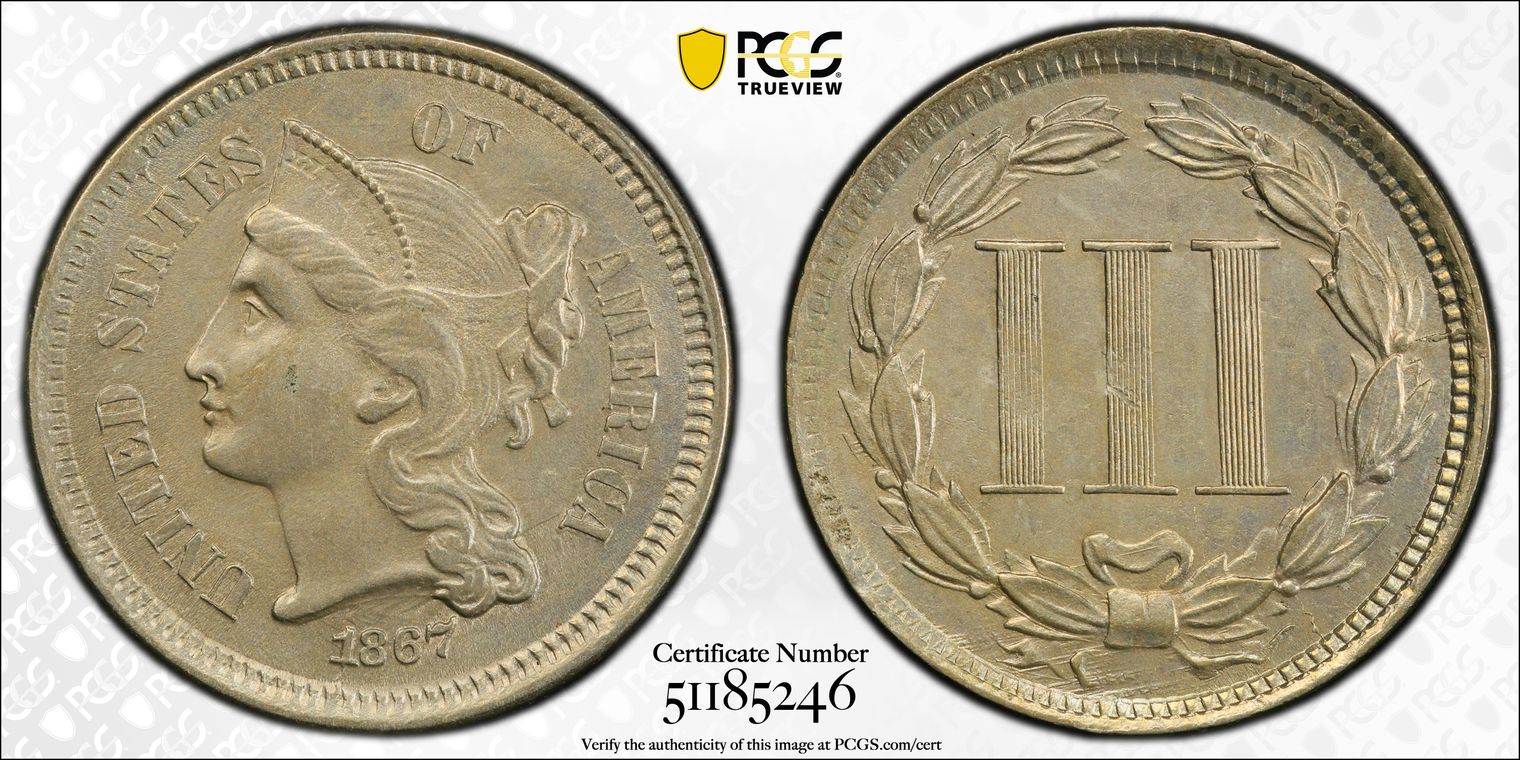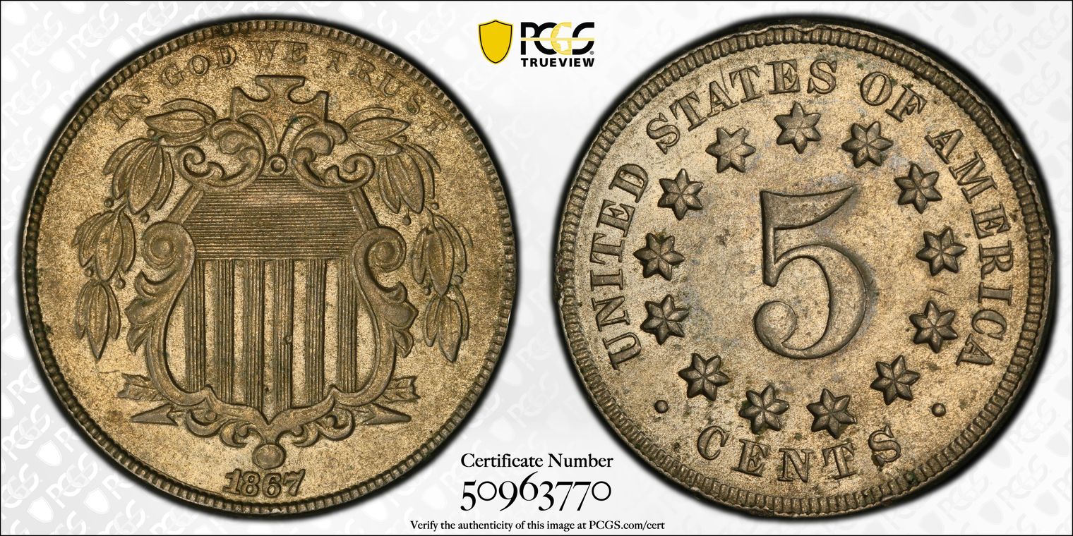 Ex. Gerry Fortin Collection. Long Flag 1, F105a. From FGRC description: "The 1869 Philadelphia issue was produced with two different date punch styles, the Short Flag 1 and Long Flag 1, with the latter seen on most Mint State examples. The strike is essentially complete with a partial wire rim."