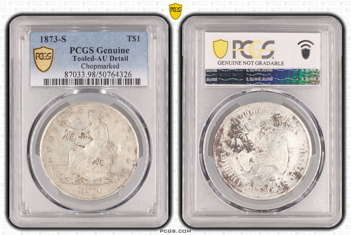 The 1873-Philadelphia is an extremely difficult Trade Dollars to find chop marked with a straight grade, My prior placeholder was a PCGS Details Grade that I was thankful to have even found. On the obverse are two carefully placed chops one of which is the character 大 ( dà - dài ) translated as big. Population Total 11, Higher 3, Lower 5. This coin passed through a prominent Trade Dollar collector and. I am very happy to have it leading off my modest collection having obtained same at a recent auction. Ex DDR