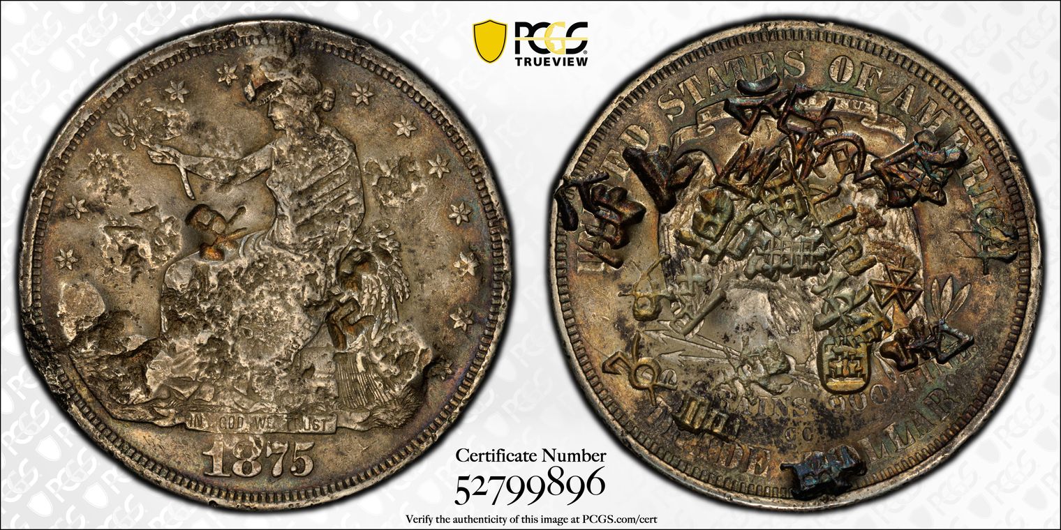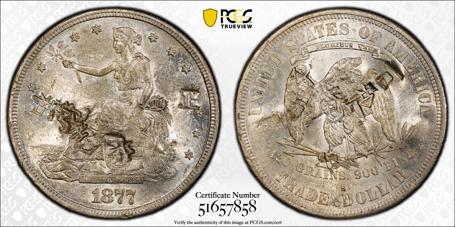 Formerly NGC UNC Details that crossed to PCGS (my first PCGS submission) with a straight Chopmarked grade, a very attractive Trade Dollar with three obverse Chopmarks nicely positioned. While I had hoped for a higher grade in comparison to subsequent PCGS submissions I am very pleased. I personally consider this Trade Dollar to be the best in my collection. The middle chopmark is 升( shēng). Ex The Long Island Collection (via HA)
