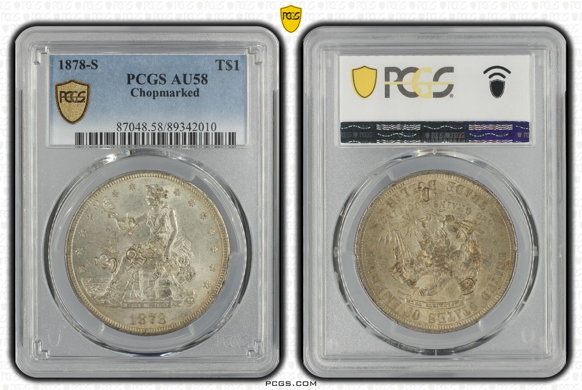 Formerly a NGC UNC Details Trade Dollar that was crossed to PCGS as AU58.