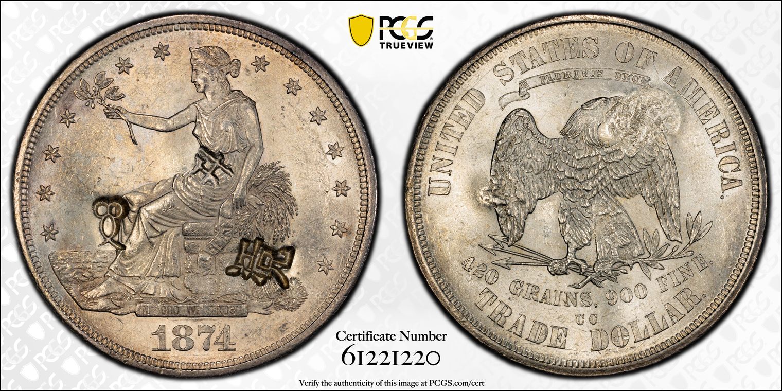 Recently acquired this Non Details upgrade; Non Details Grade Total Population is 82. In addition to a “test mark” this Trade Dollar includes the Chinese chop 吉 (Ji) meaning luck and propitiation. With the extreme difficulty to acquire a 1878-CC with chopmarks this Trade Dollar being my last registry entry with “Ji” (Lucky) might be just the perfect closure to bring good luck in filling the elusive 1878-CC chopmark slot. This Trade Dollar originally had a horrible “slab view” for a Trueview that was remedied by reholdering.