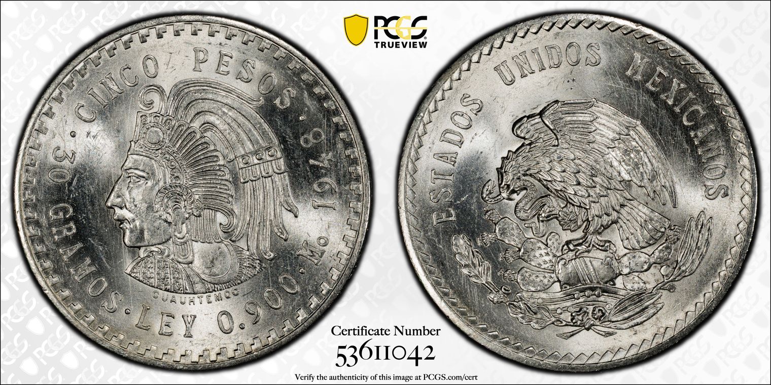 1948-Mo 5 Peso Cuauhtemoc KM-465 Ag MS63