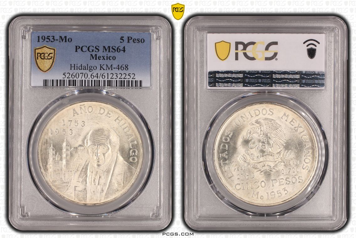 1953-Mo 5 Peso Hidalgo KM-468 Ag MS64