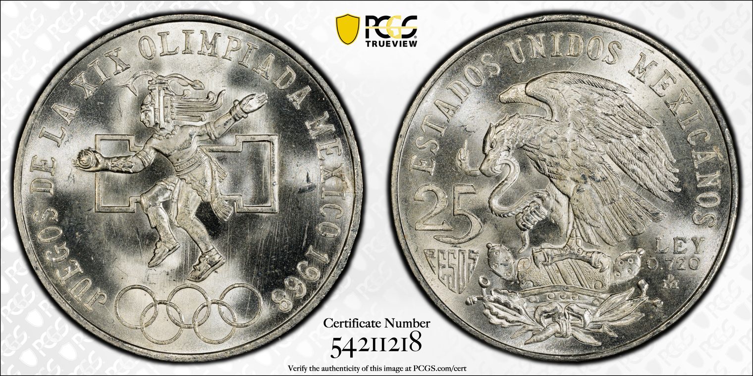 1968-Mo 25 Peso Olympic KM-479.1 Rings Align, Straight Tongue MS67
