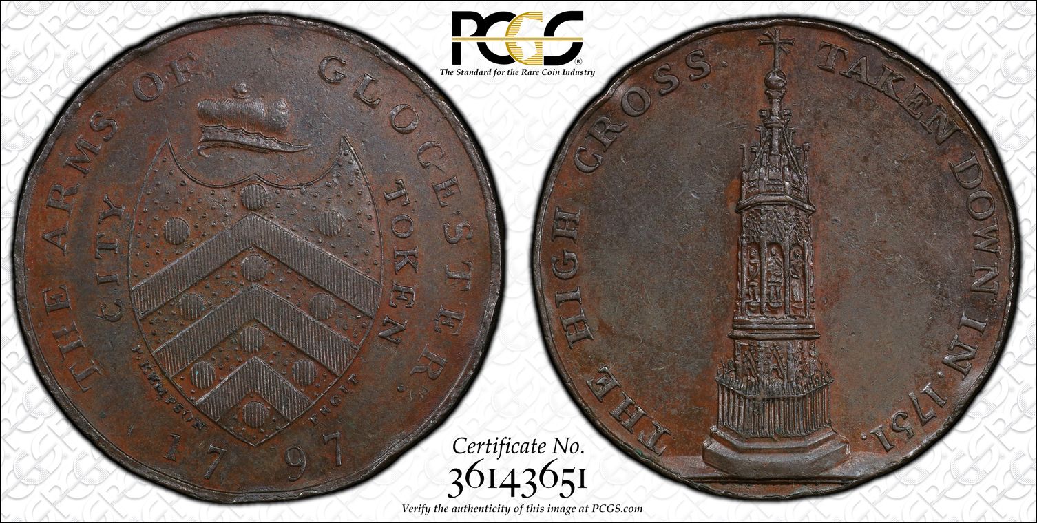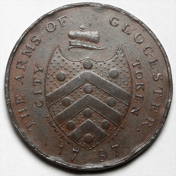 GREAT BRITAIN - GLOUCESTERSHIRE 1 PENNY 1797 : Genuine UNC Detail (Rim Damage) ; DH-9 ; in Gold Shield Holder. ( Initially PCGS labelled the token as 1/2 D, not 1D.