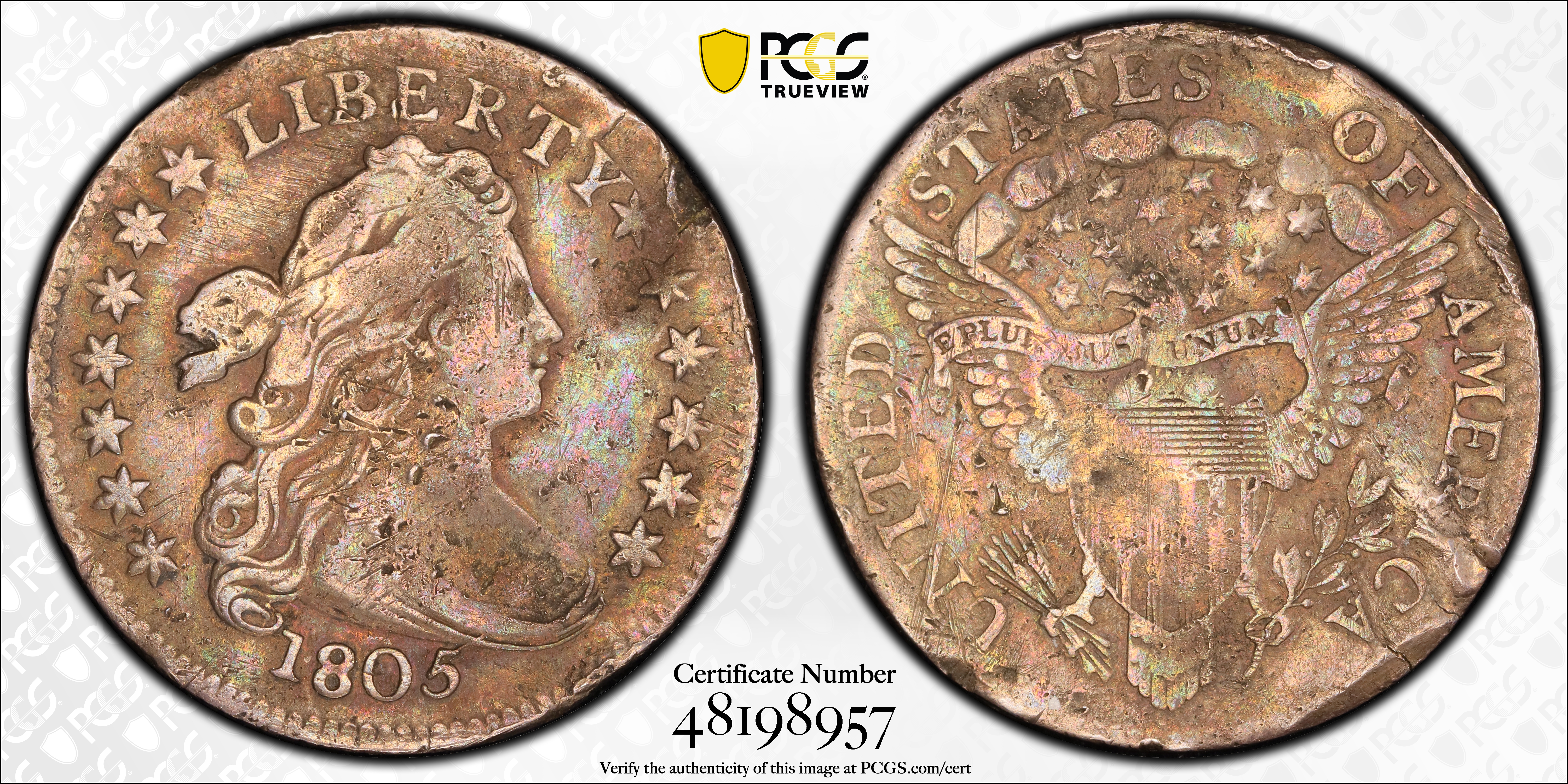 The 1805 Dime has a mintage of 120,780 pieces, the second highest of the Draped Bust series, but only two varieties comprise the entire mintage. JR-1 has 5 Berries on the reverse and JR-2 has 4 Berries on the reverse. Both are of roughly equal rarity, though the 4 Berries reverse is slightly more common.