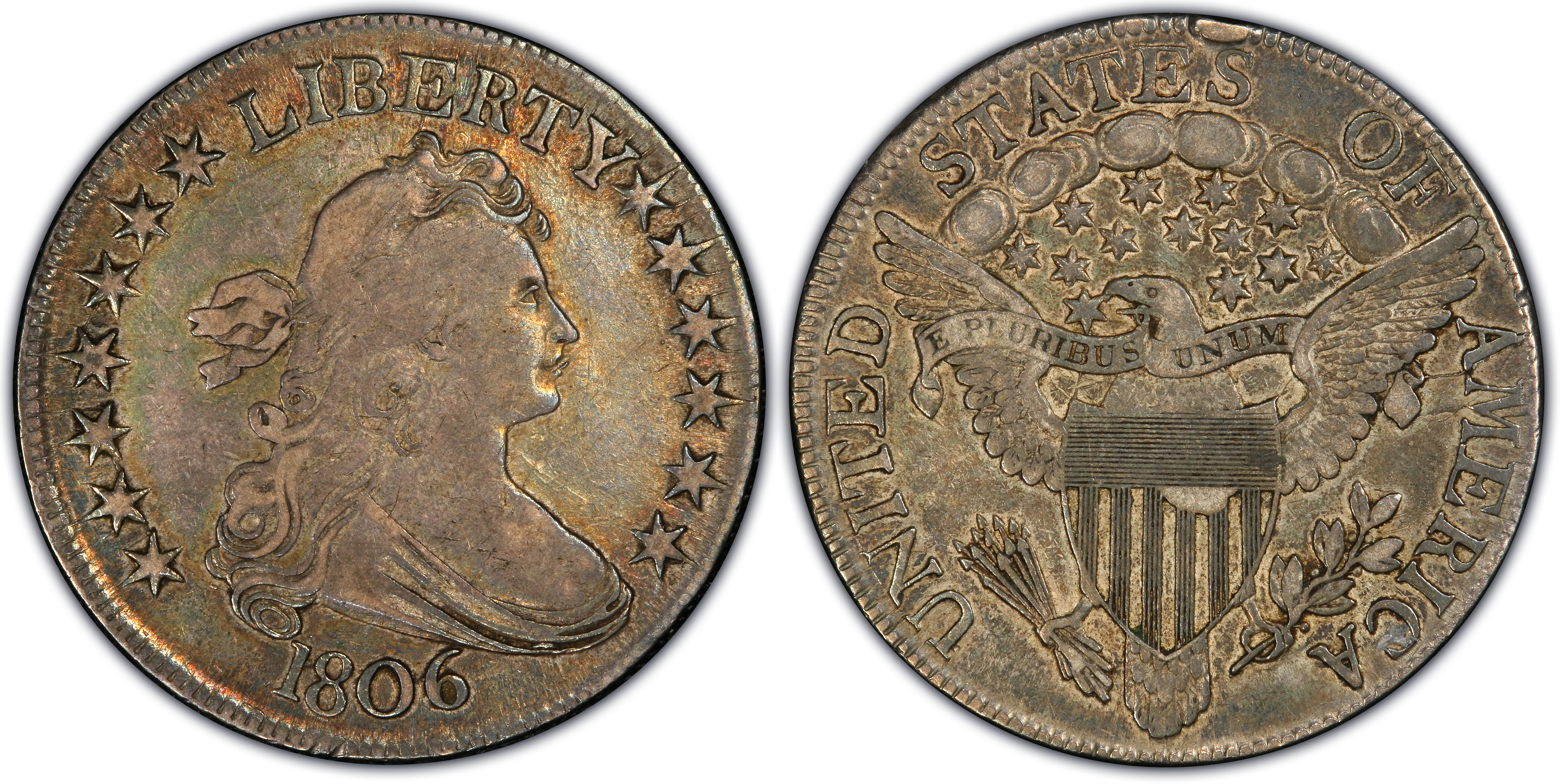 The 1806 Pointed 6, Stems Half Dollar is one of the more common major types of the year. Nineteen different Overton varieties, plus their die states, comprise the entire mintage of this major variety. As such, collectors have many opportunities to acquire an example in a wide range of grades, including Mint State (PCGS has certified more Mint State examples of this type than any other -- by far). The PCGS CoinFacts Condition Census starts at MS64+ and goes up from there. The record price for this date was achieved by the Garrett coin when it reappeared at auction in 2015 and sold (as a PCGS MS66) for $182,125. However, there is an even better example "out there" -- a PCGS MS67 that has yet to come to market. That coin is the single finest Draped Bust Half Dollar in existence.