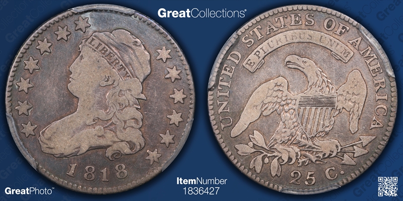 In 1818, Mint employees pulled out all the stops and cranked out over 361,000 Quarter Dollars, the largest mintage for the denomination since its inception in 1796, and a record that would remain unbroken until 1831. As a result, the 1818 is the most plentiful of the pre-1831 Quarters -- by far -- and it is an excellent choice for type purposes. Numerous Mint State examples exist, but it would be a stretch to call them common. The best example is a solitary PCGS MS67 currently in the High Desert Collection. This outstanding coin is lustrous and has tremendous eye appeal because of its colorful, original toning.