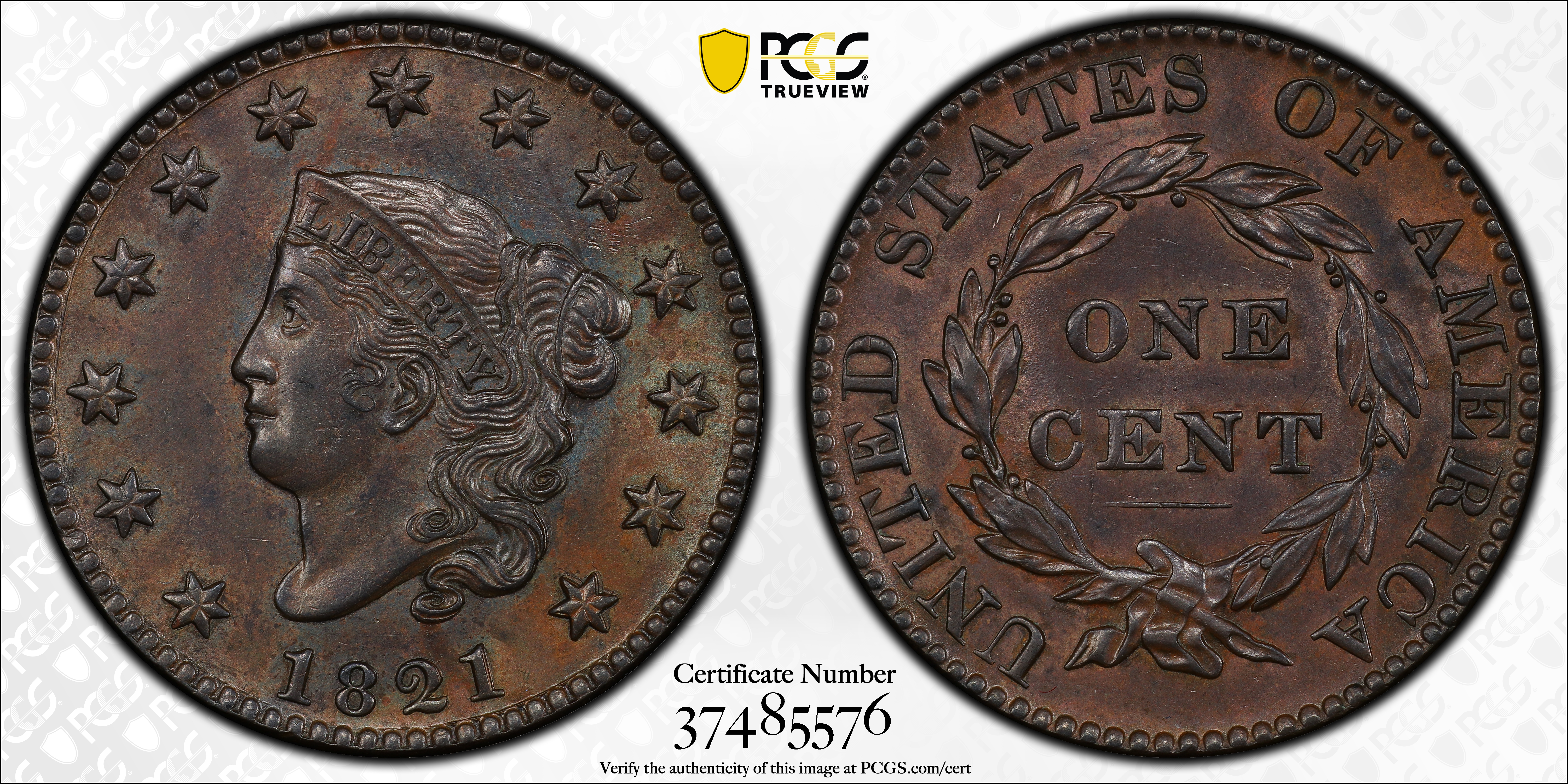 1821 1C, BN AU58BN 认证号37485576, PCGS号1621
