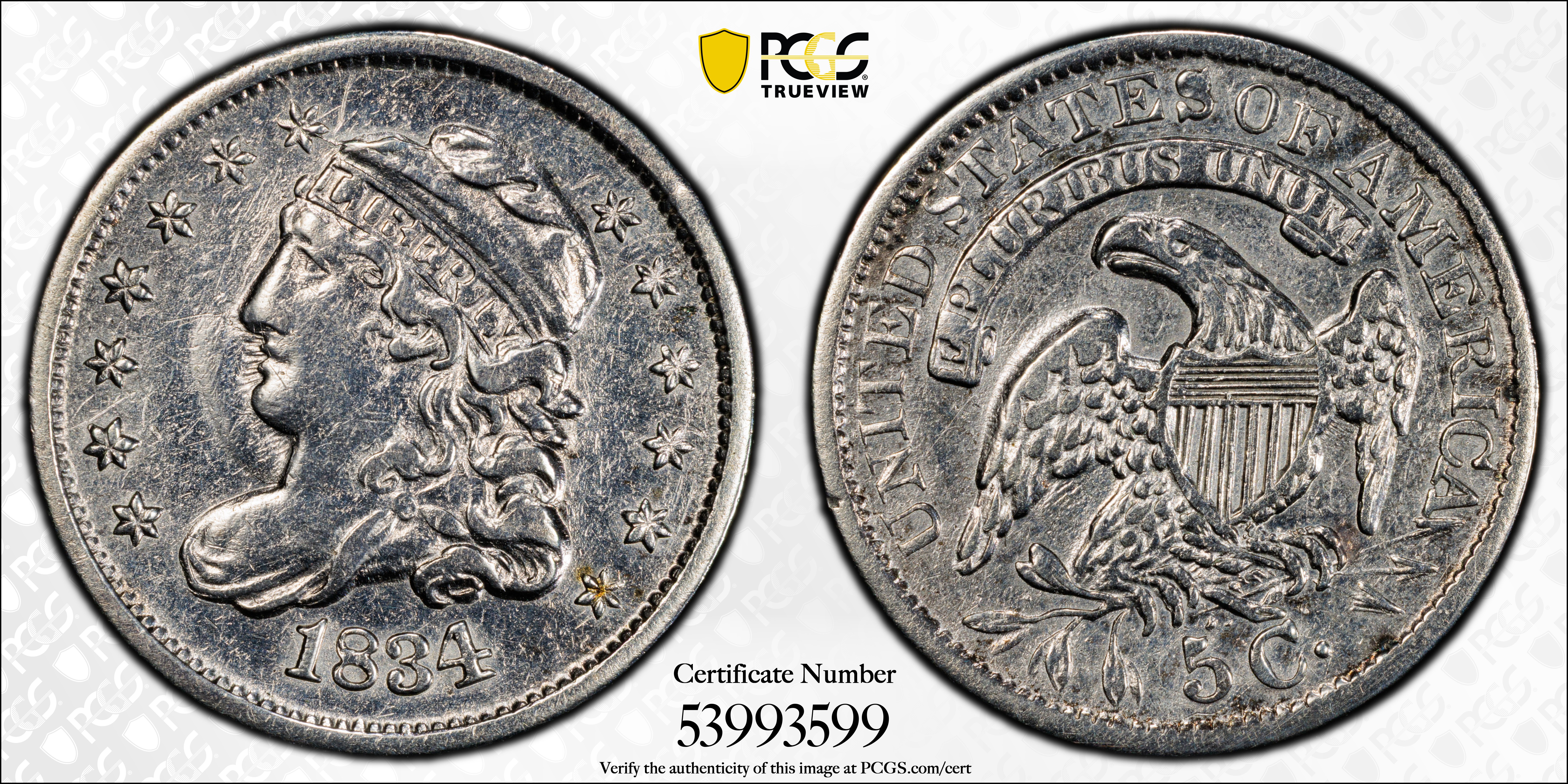 The 1834 Half Dime is a common coin, with a mintage just shy of 1.5 million circulation strikes.