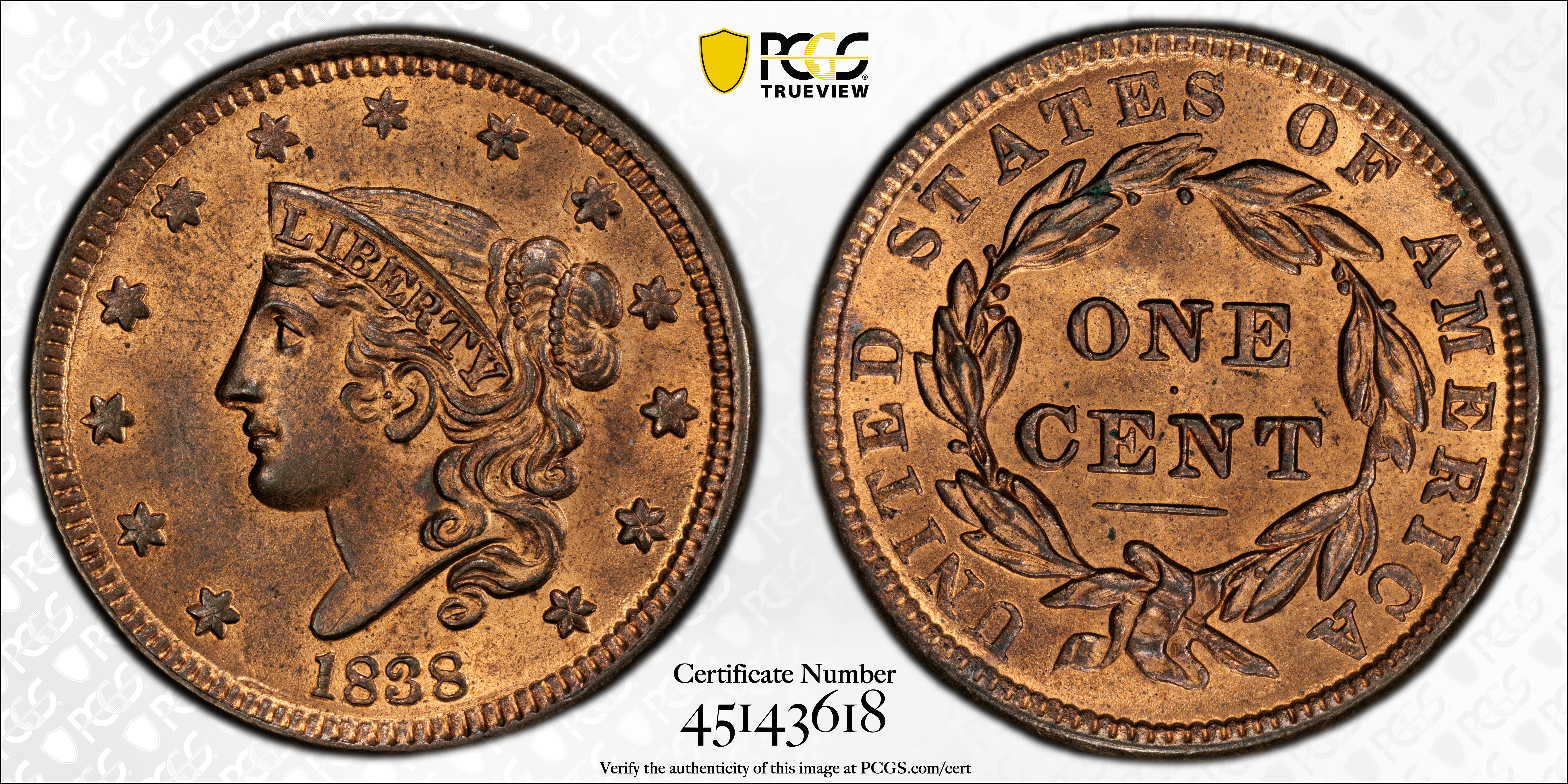 1838 1C N-4, RB MS65RB 认证号45143618, PCGS号37190