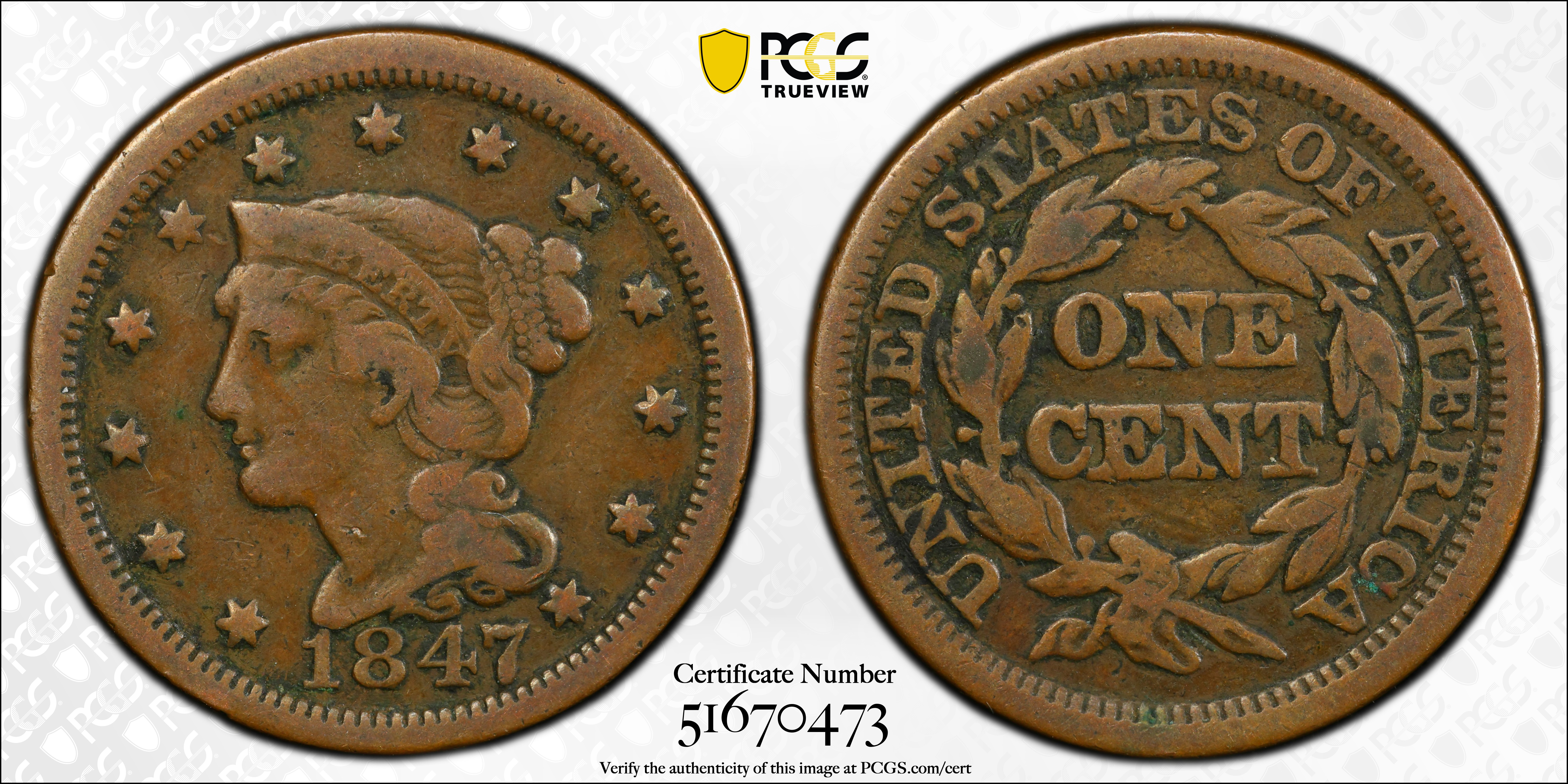 1847 1C, BN F12BN 认证号51670473, PCGS号1877