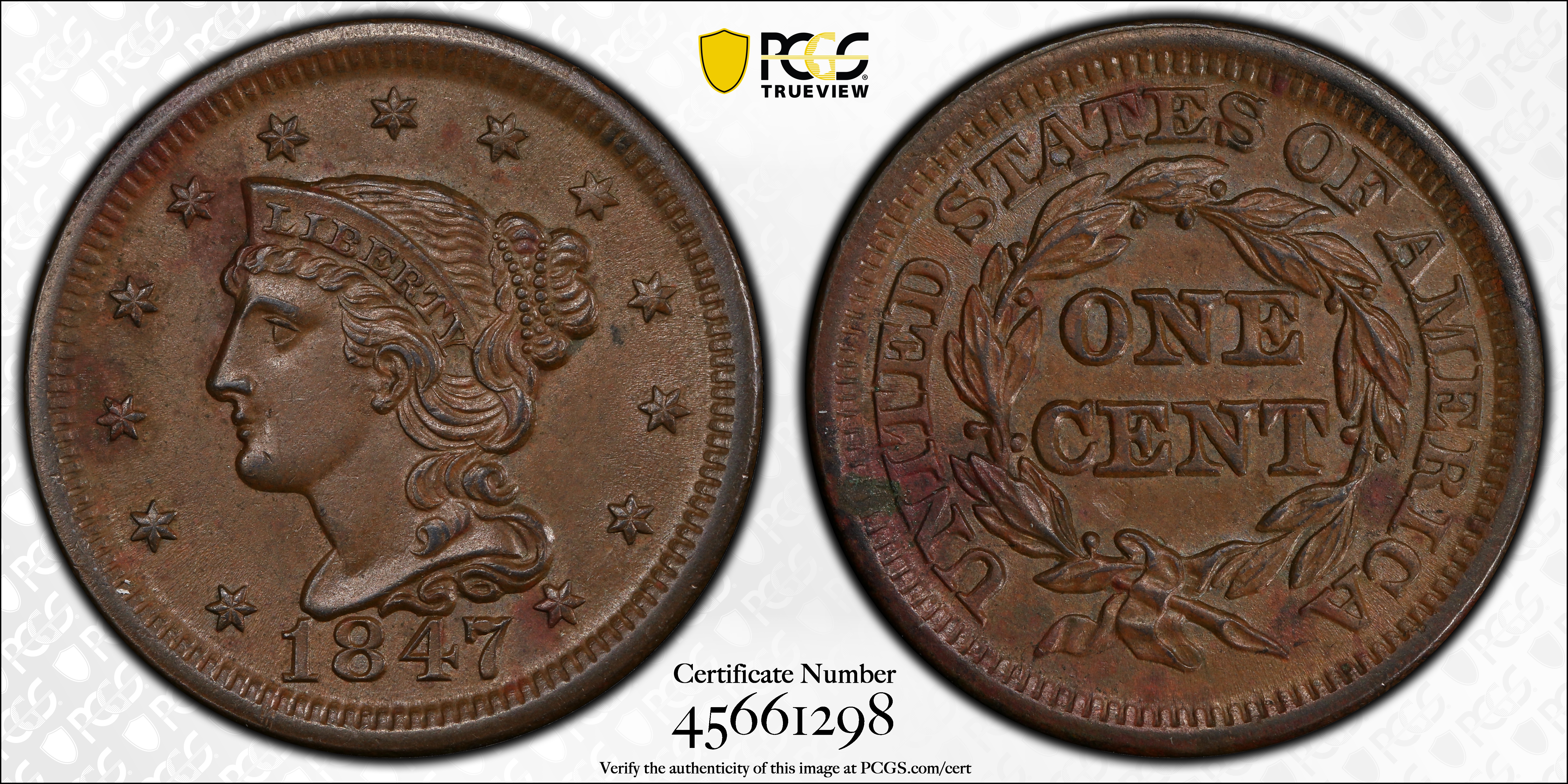1847 1C, BN AU58BN 认证号45661298, PCGS号1877