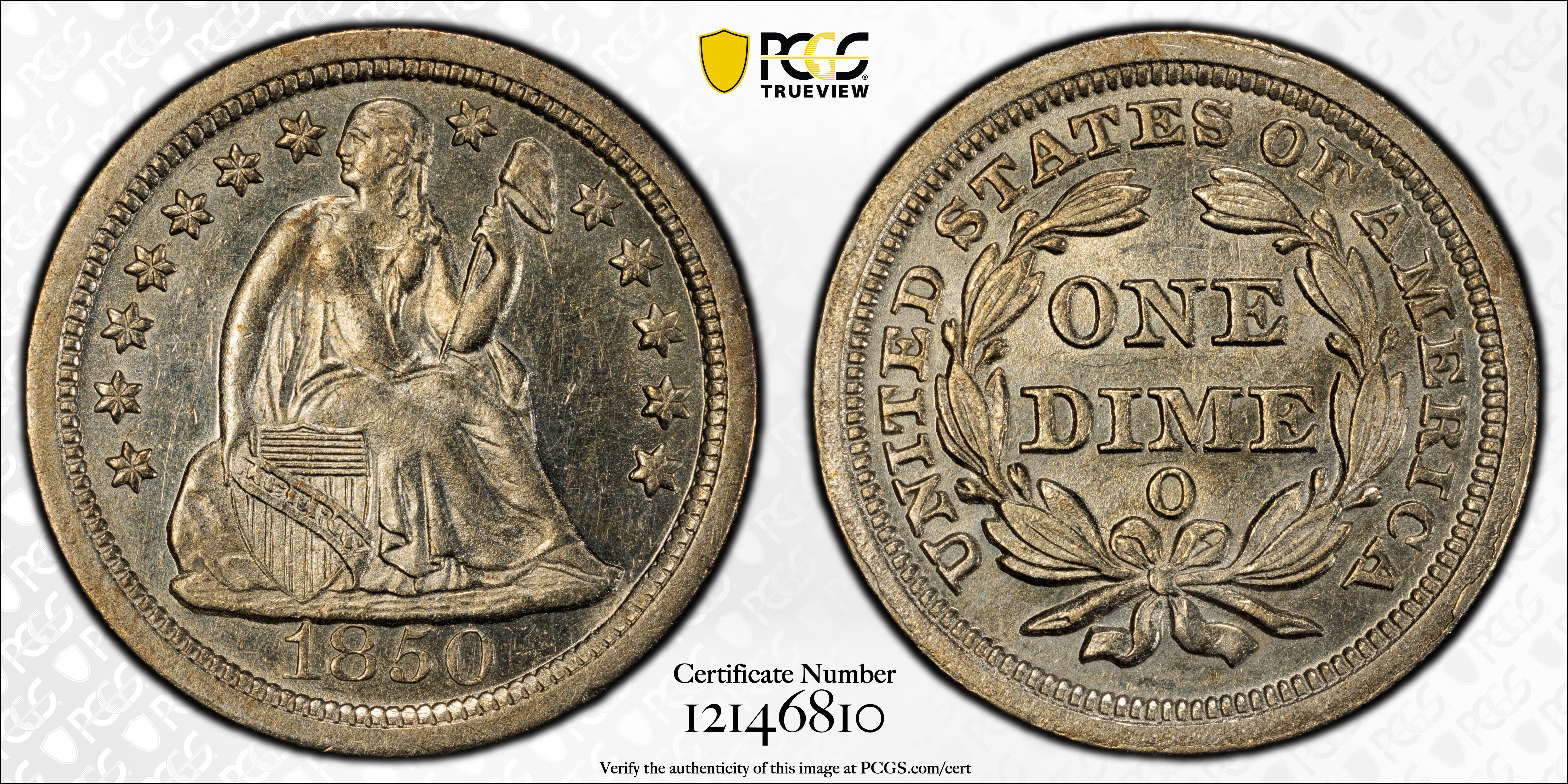 1850-O 10C F-101 Large O AU58+ 认证号12146810, PCGS号537895