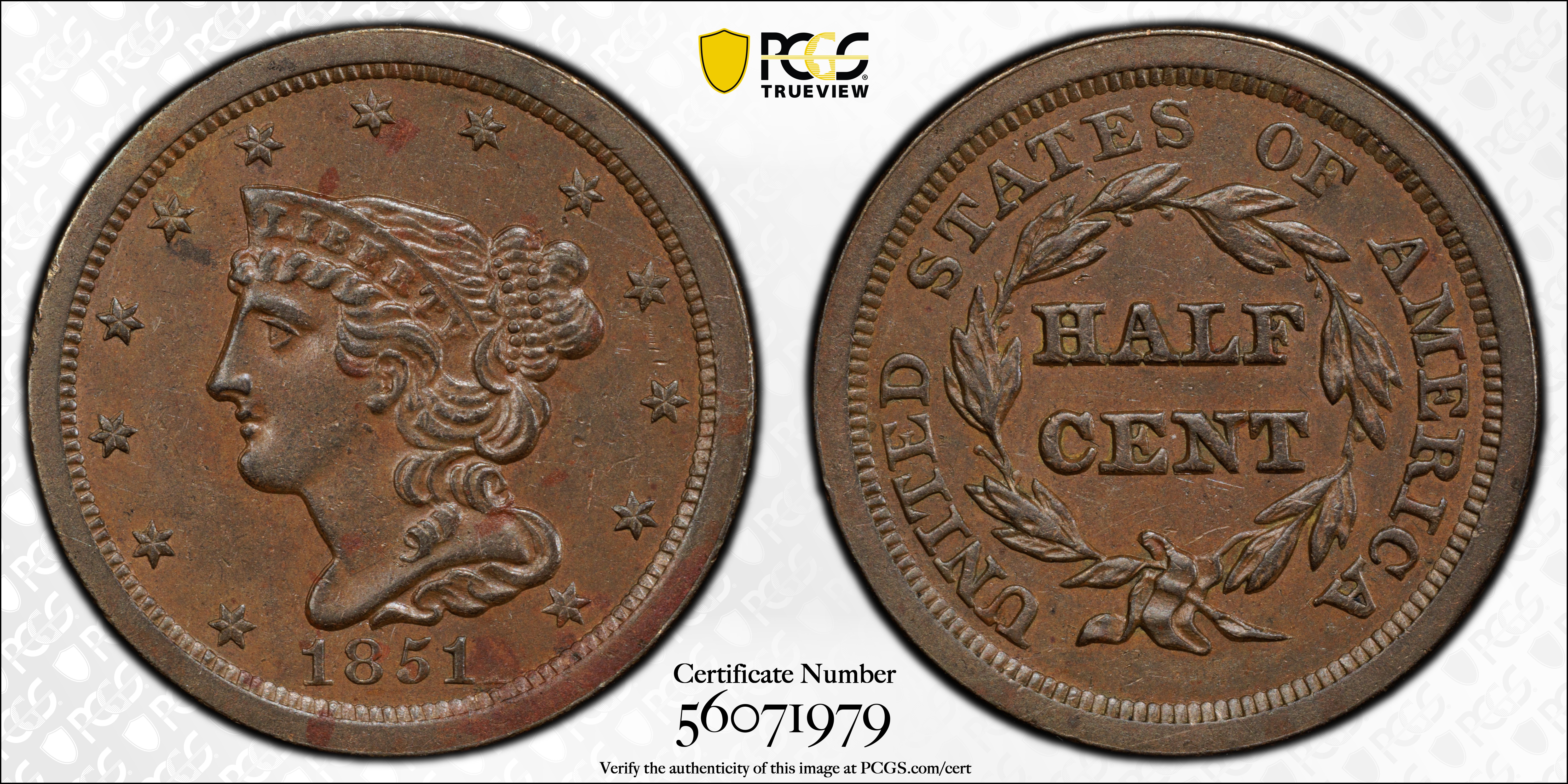 1851 1/2C, BN AU58BN 认证号56071979, PCGS号1224