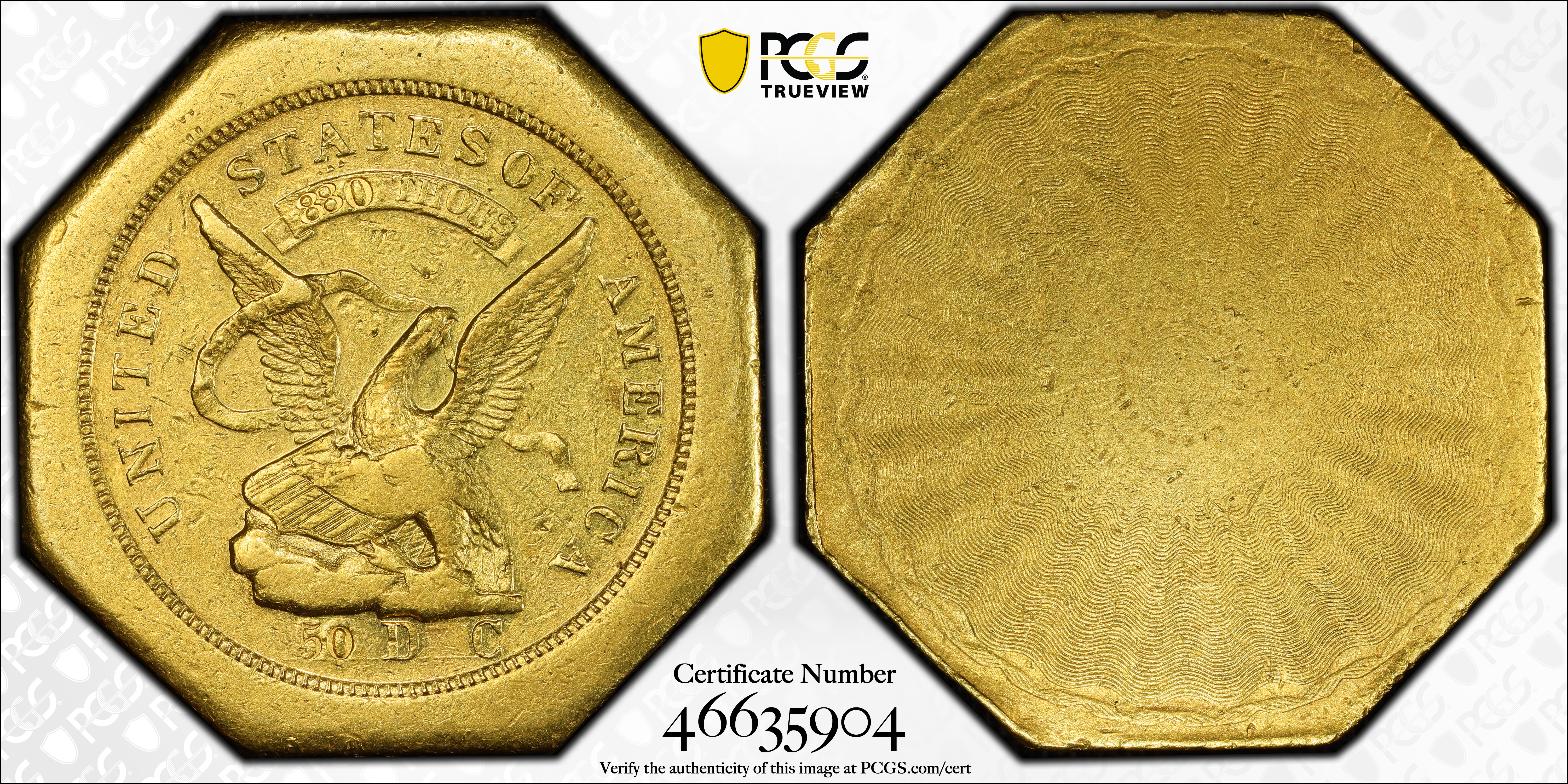 In 1851, Augustus Humbert began producing $50 gold coins at a provisional U.S. Assay Office. These large coins, also known as "Slugs", brought some sense of order to the chaos of the gold dust economy in San Francisco. Weights and purity became standardized, thus mitigating much of the cheating and dishonesty that marred business dealings during the Gold Rush. As with any first attempt, Humbert encountered several problems, mostly with the excessive number of steps required to produce a single coin. First came the striking of the coin itself, followed by hand-stamping each of the eight edges, punching "880" into the scroll above the eagle, and "50" in the field to the left of "D C" beneath the eagle. The Kagin-1 variety received an additional "50" stamp in the center of the target on the reverse; Kagin-2 did not.