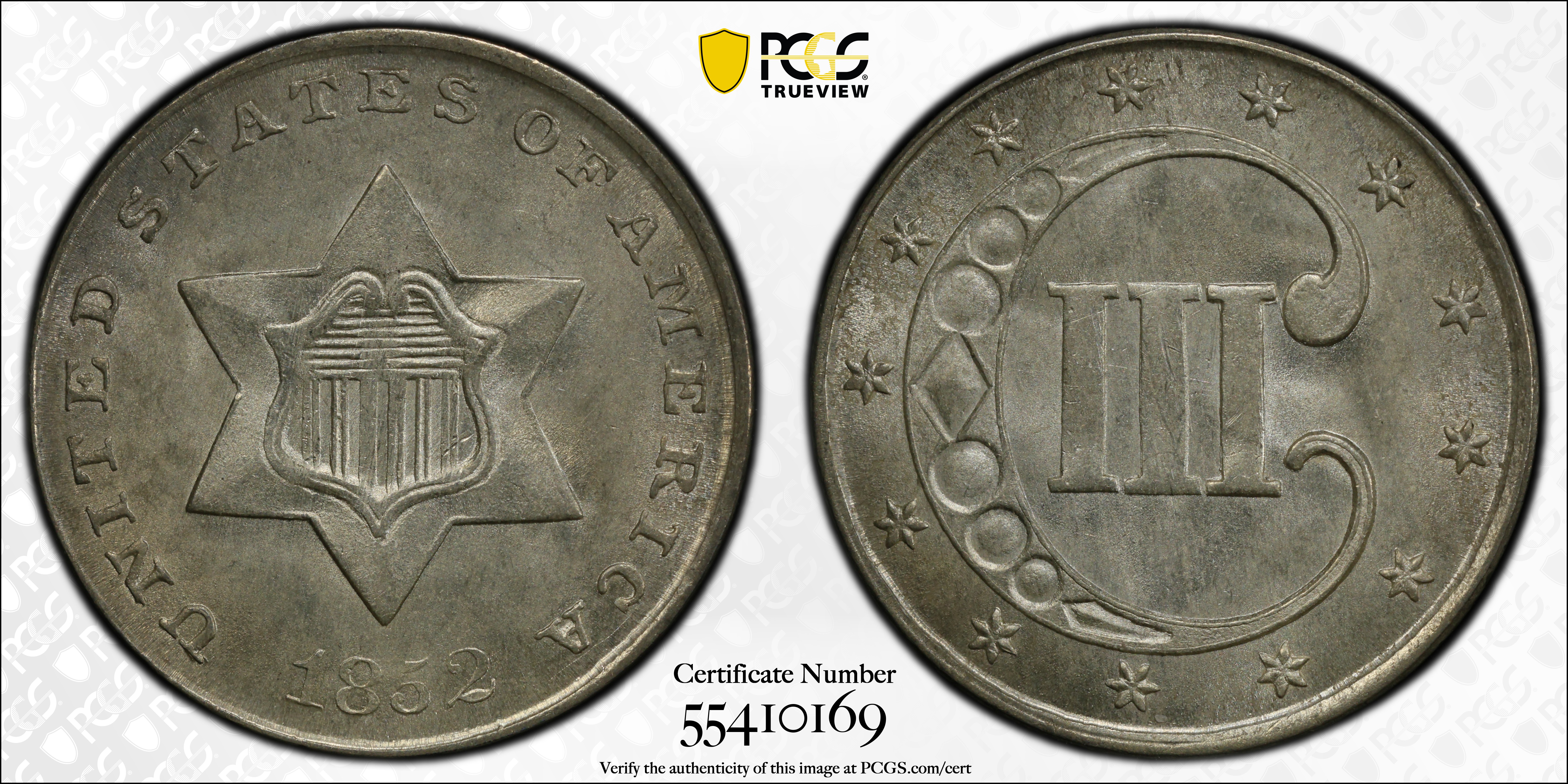 1852 3CS MS66+ 认证号55410169, PCGS号3666
