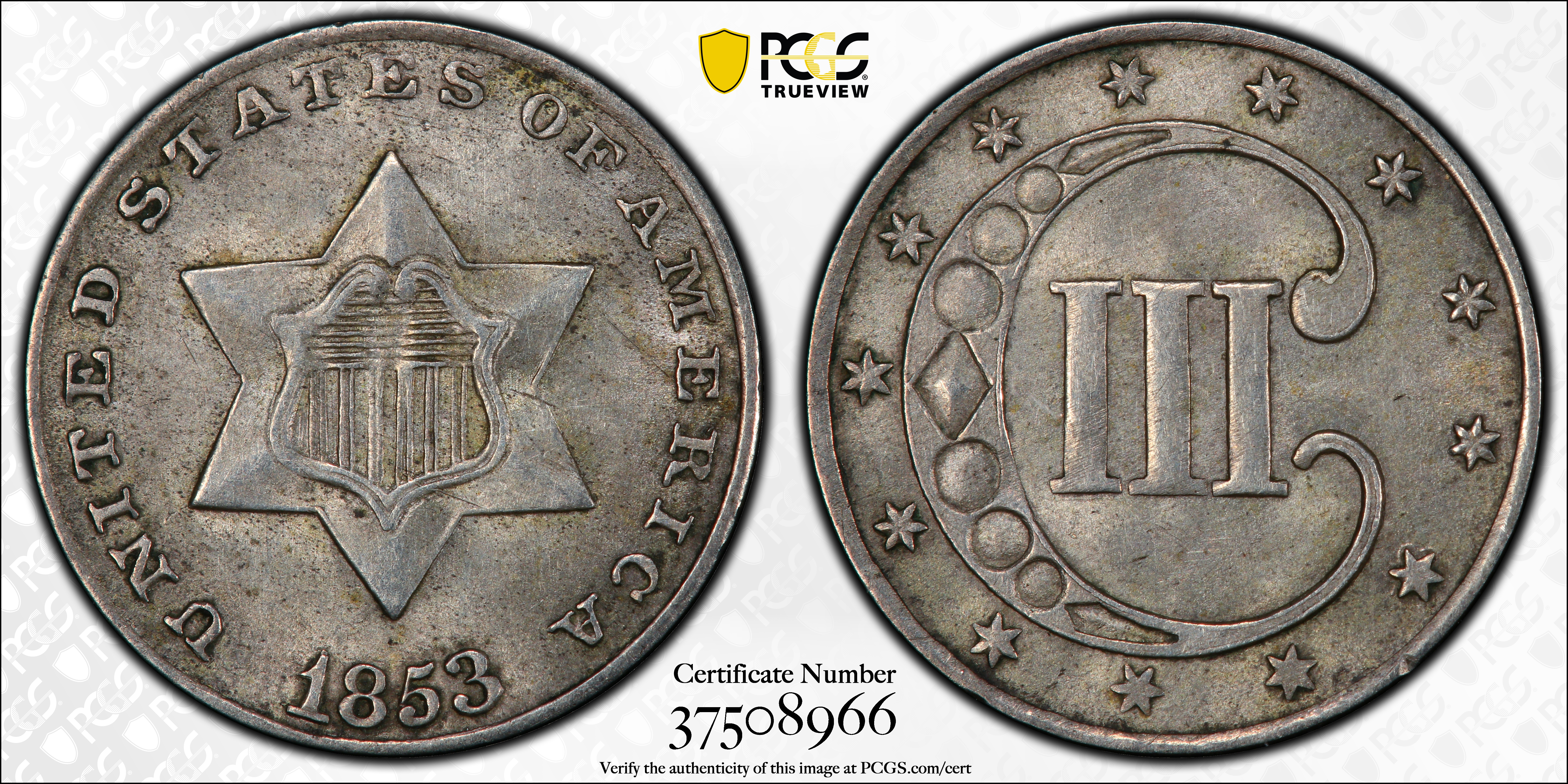 1853 3CS MS62 认证号37508966, PCGS号3667