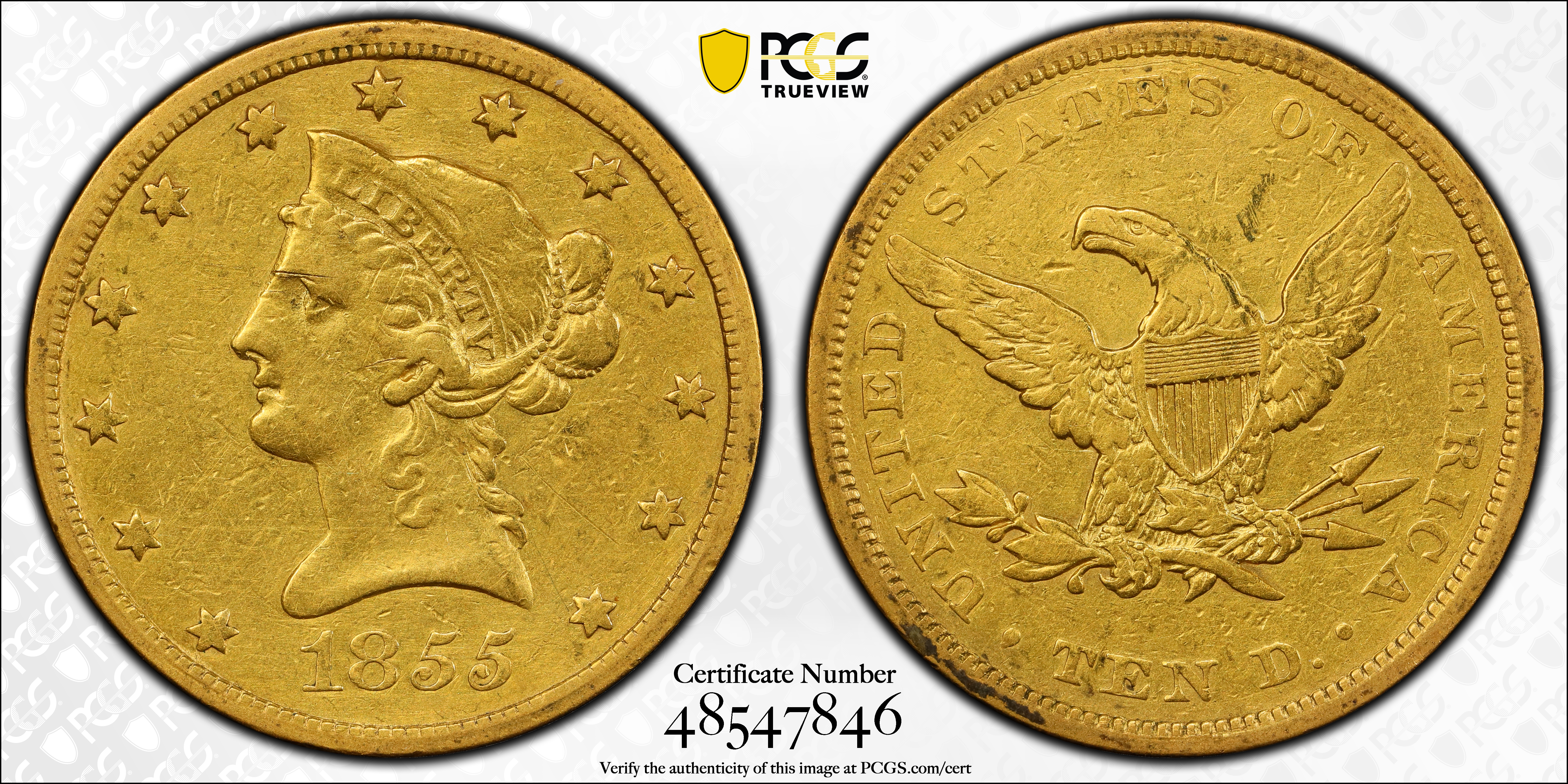 1855 $10 N1 认证号48547846, PCGS号8616