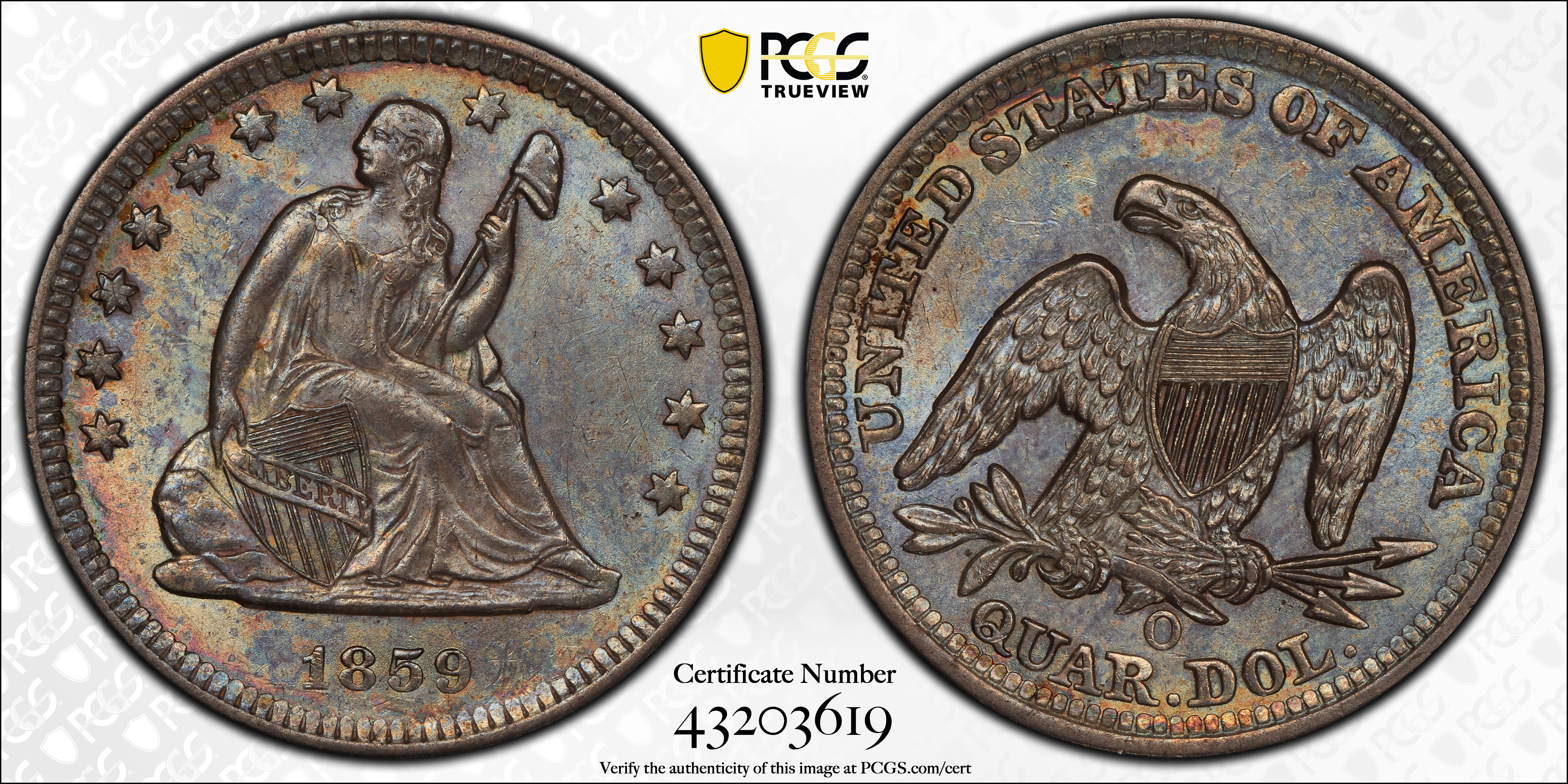 1859-O 25C MS63+ 认证号43203619, PCGS号5449