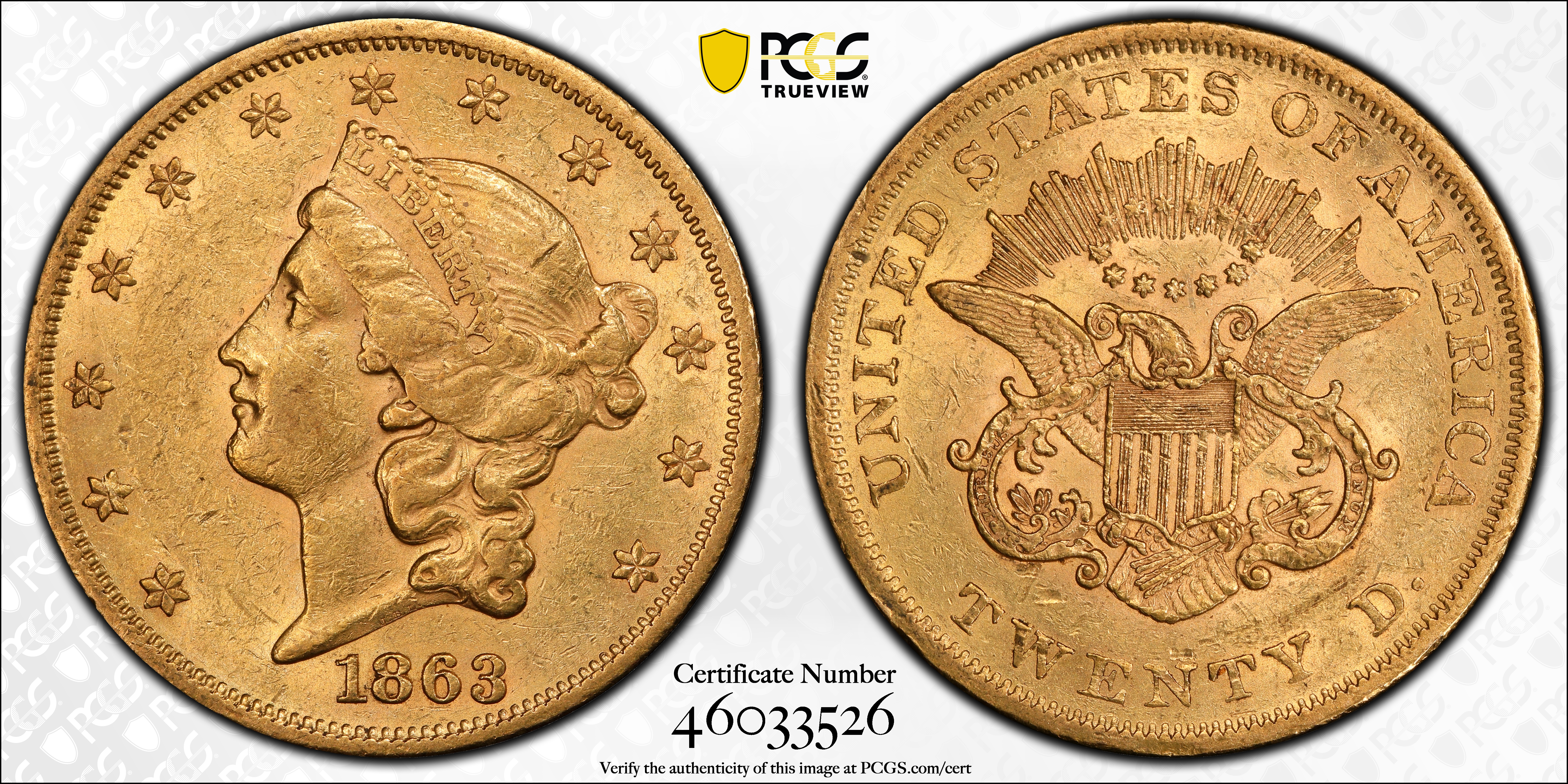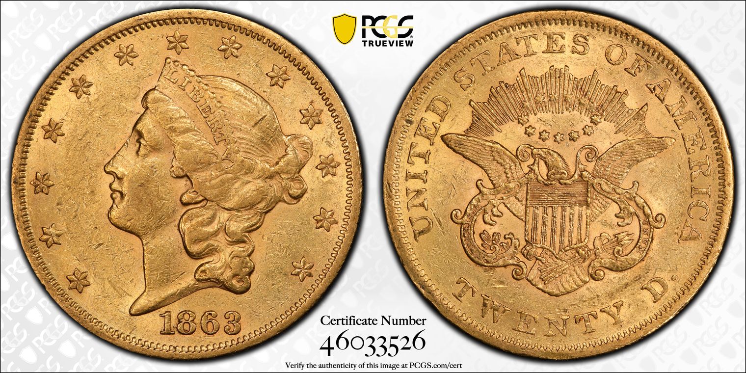 1863 $20 AU53 认证号46033526, PCGS号8939