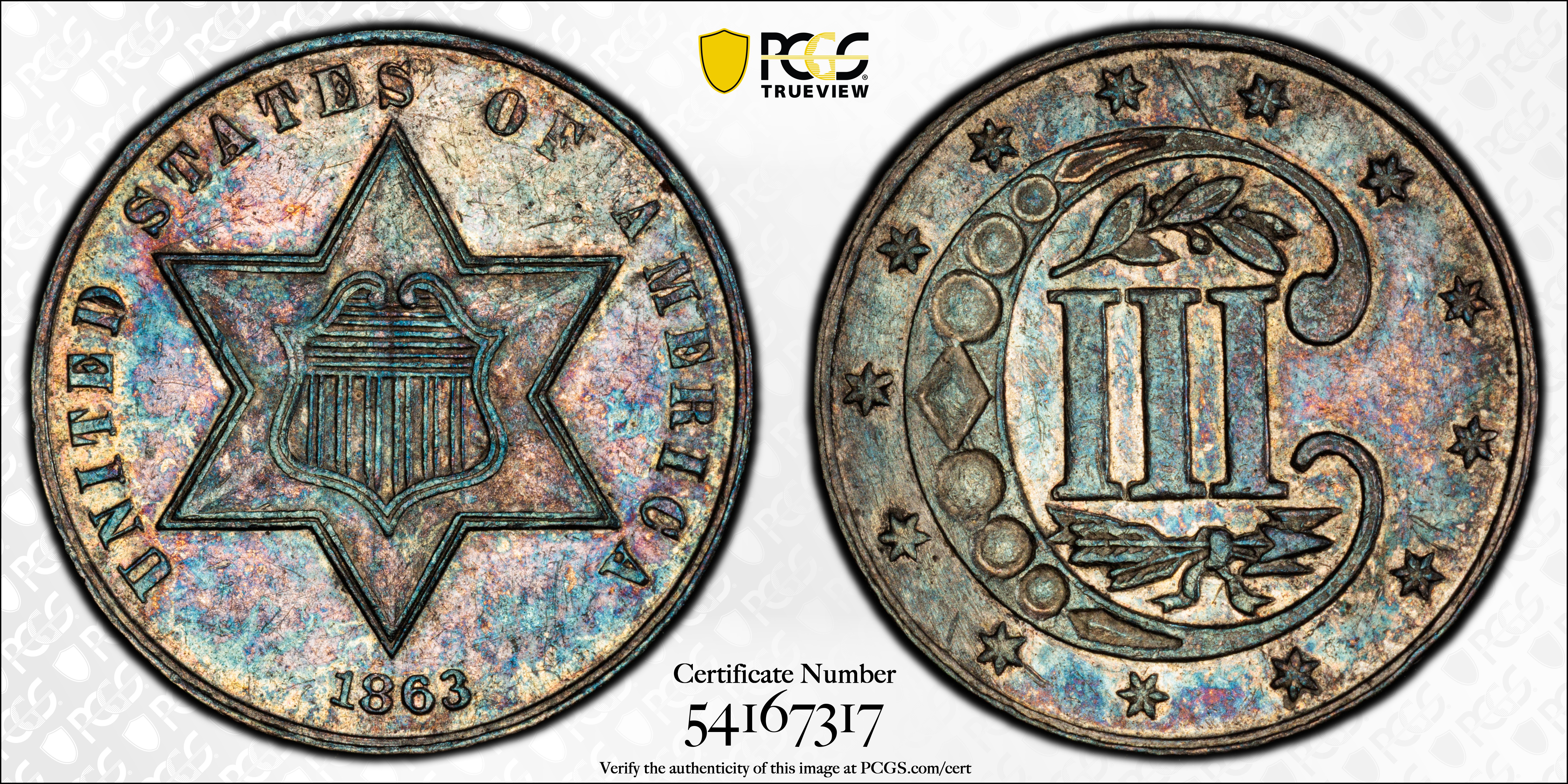 1863 3CS AU53 认证号54167317, PCGS号3682