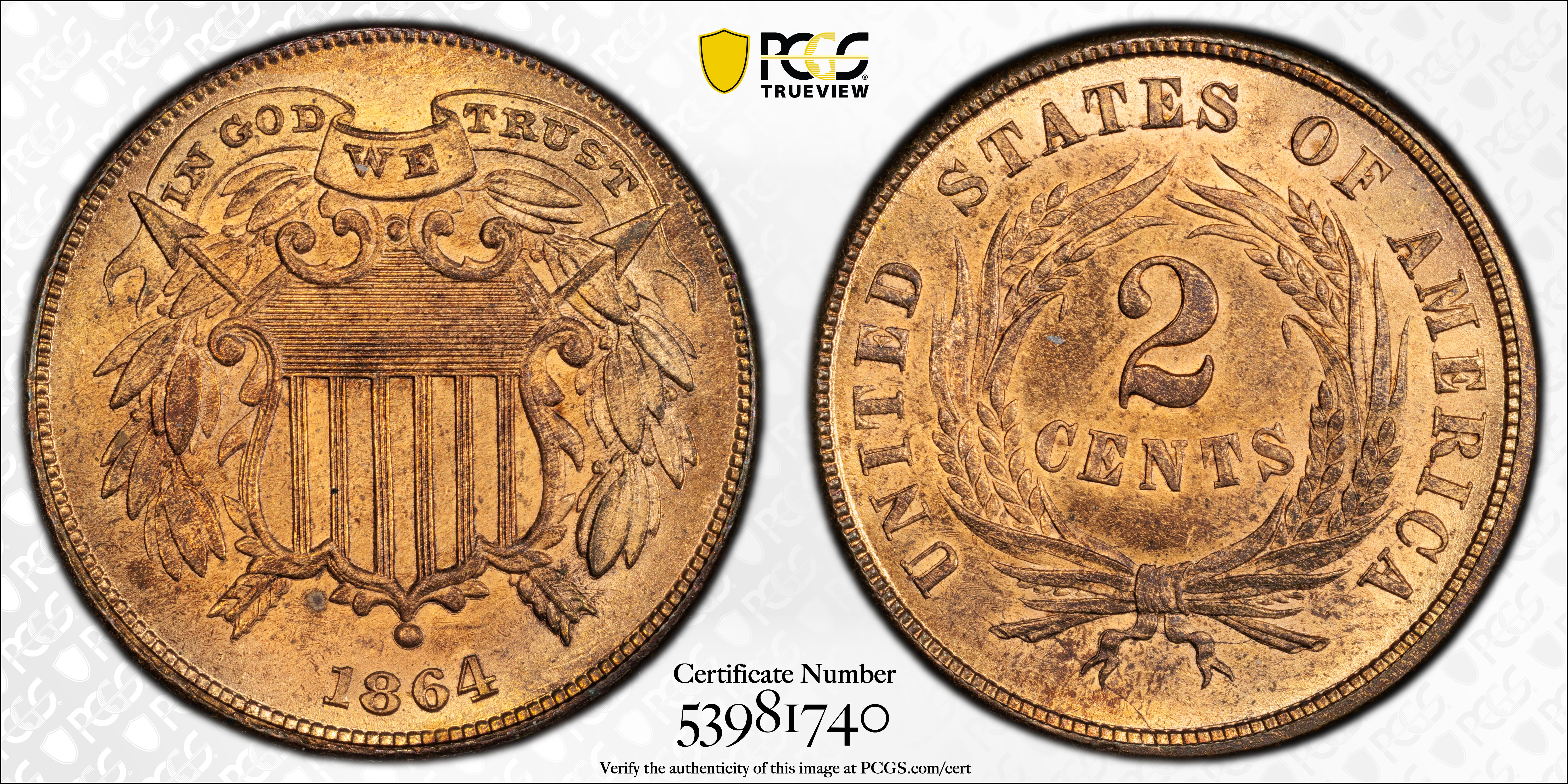 1864 2C Small Motto, RD MS65RD 认证号53981740, PCGS号3581