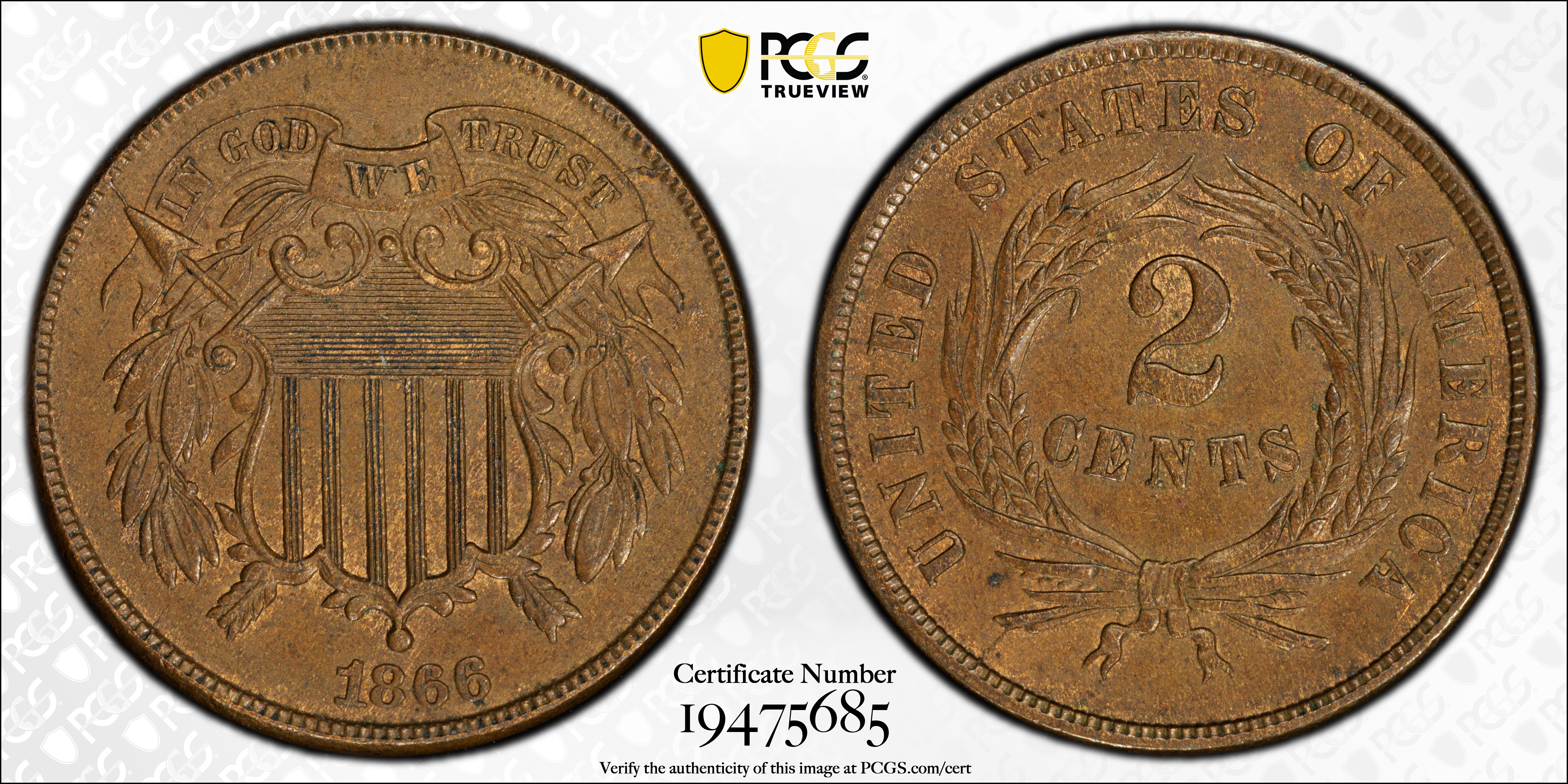 1866 2C, BN AU58+ BN 认证号19475685, PCGS号3588