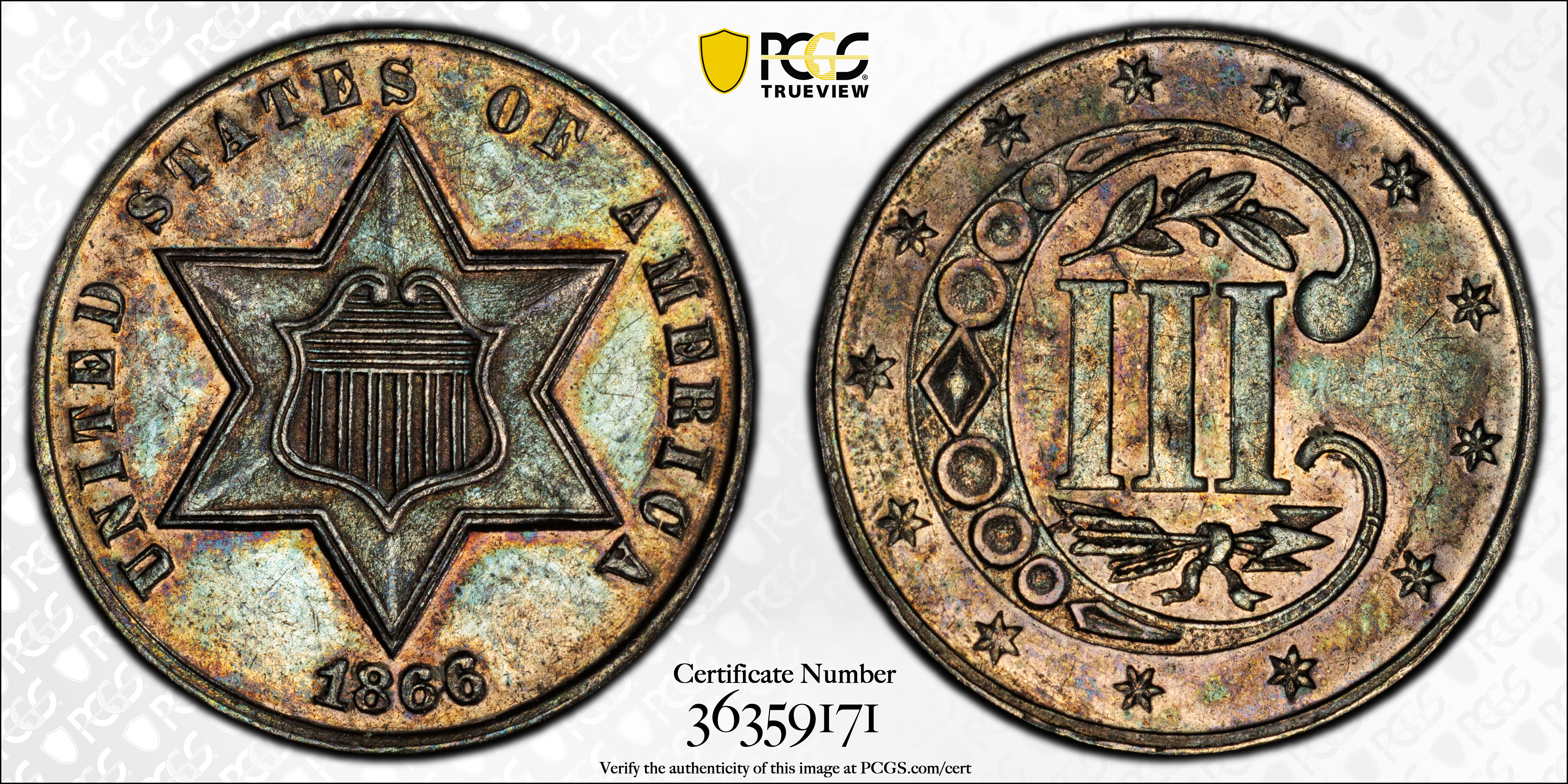1866 3CS AU58 认证号36359171, PCGS号3686